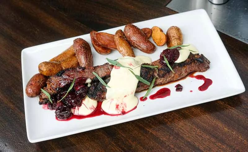 Kraft Ranch New York strip featuring beef raised in Laurel and served with Flathead cherry jam and a tallow hollandaise with confit fingerling potatoes at Walkers Grill in Billings. [/caption]