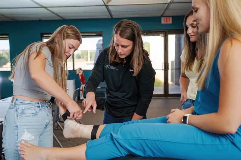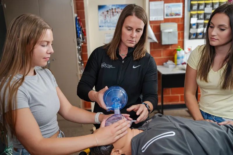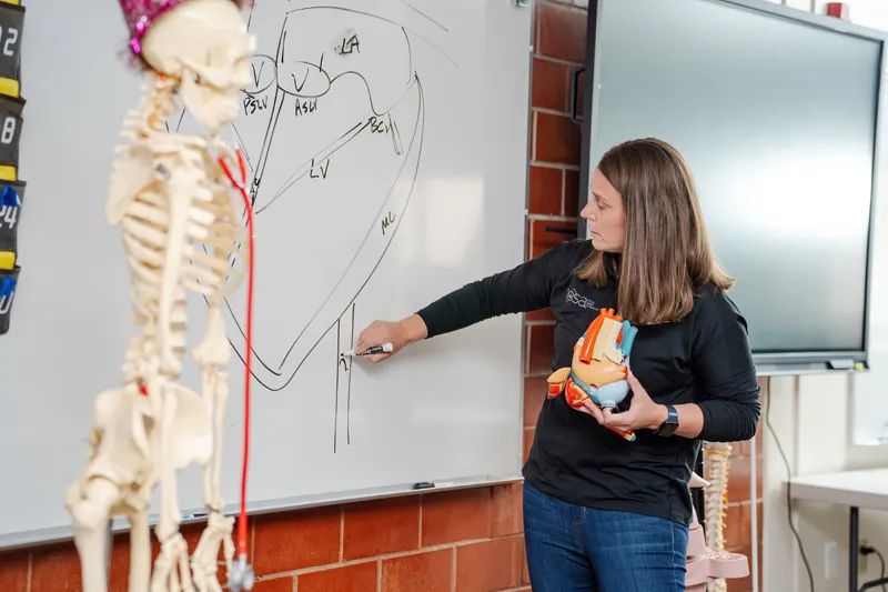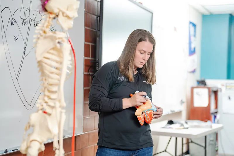 Glancing around Katie’s classroom, you’ll see mannequins lying prone on stretchers, waiting for students to practice their hands-on skills. If you look up, you might also notice a female mannequin’s head peering down from the ceiling. The oddity is the remnant of a practical joke, evidence that Katie’s class is not only rigorous but fun.