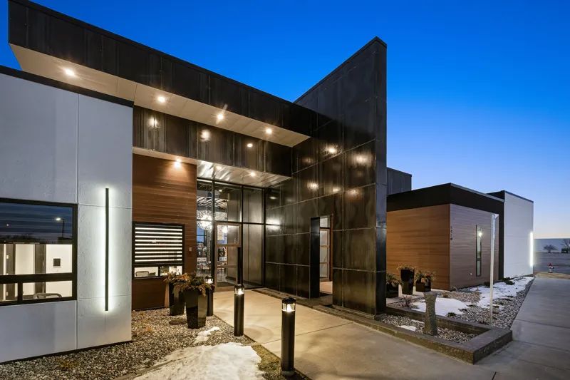 The nearly 7,200-square-foot building stands tall on the corner of 24th and Gabel. Its exterior features soft grayish stone with varied heights of stacked stone and is graced with a plethora of sizable windows and bright red accents. Subtle linear sconces enhance the suave look.