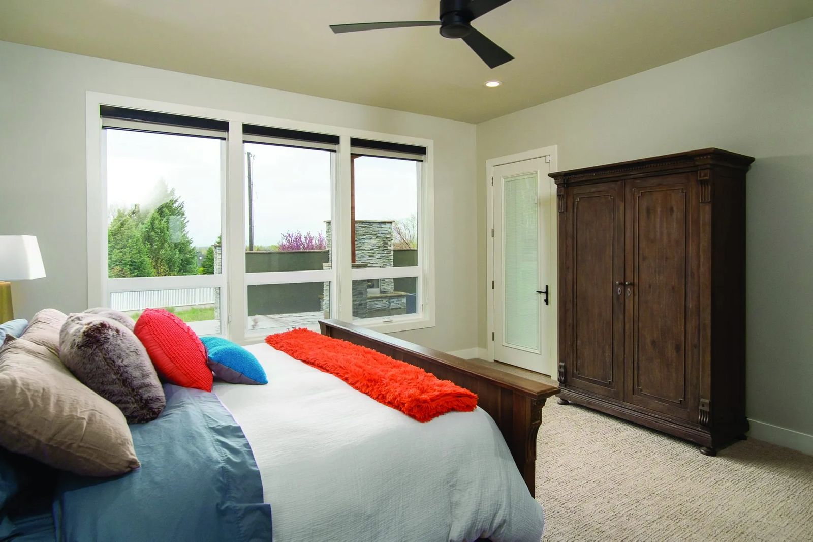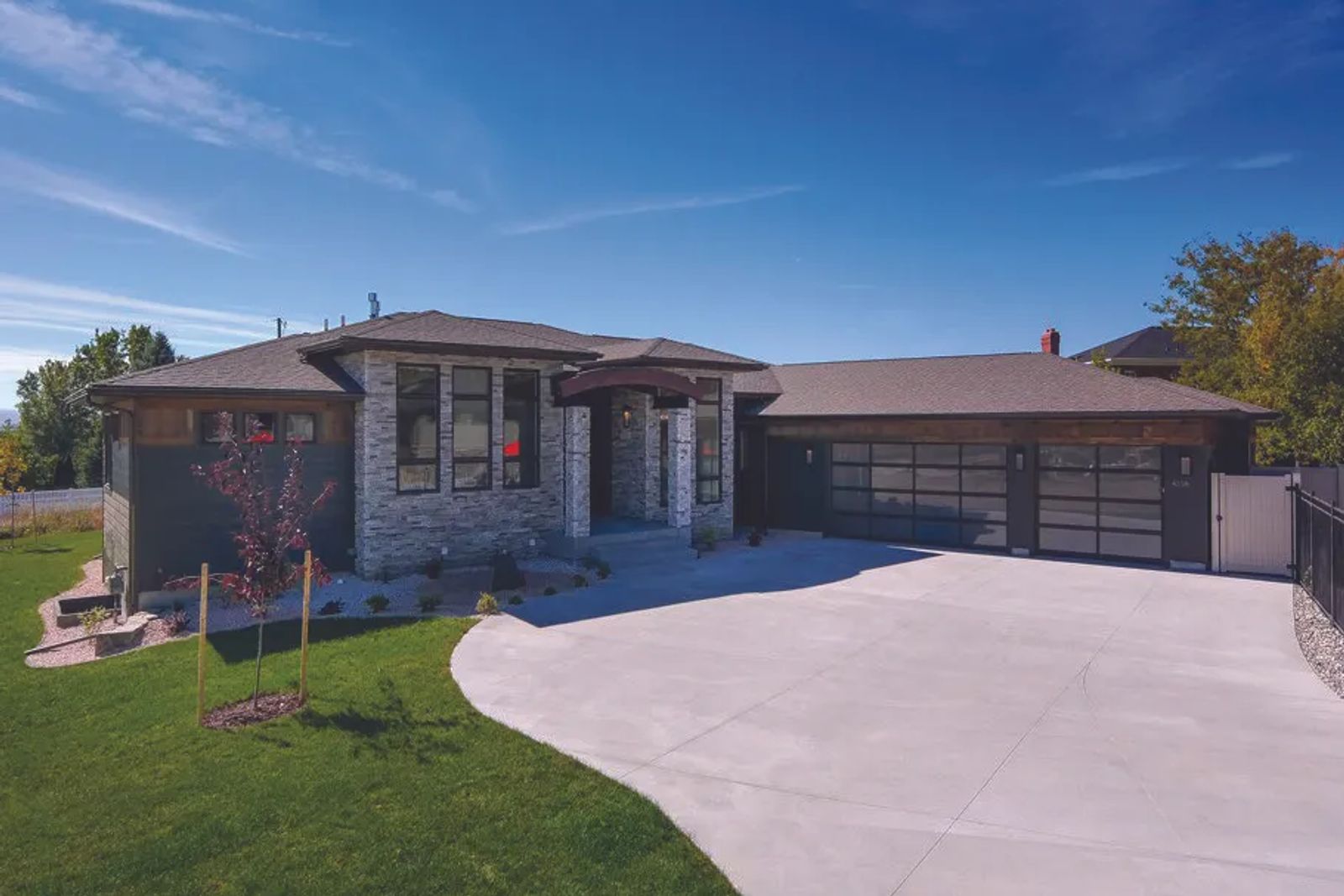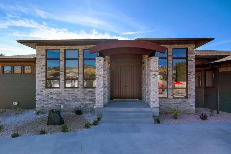 The garage doors showcase frosted glass panels. These stylish panels lend a simplistic modern approach to the home’s exterior façade of dry-stacked cultured stone and weathered cedar trim accent.