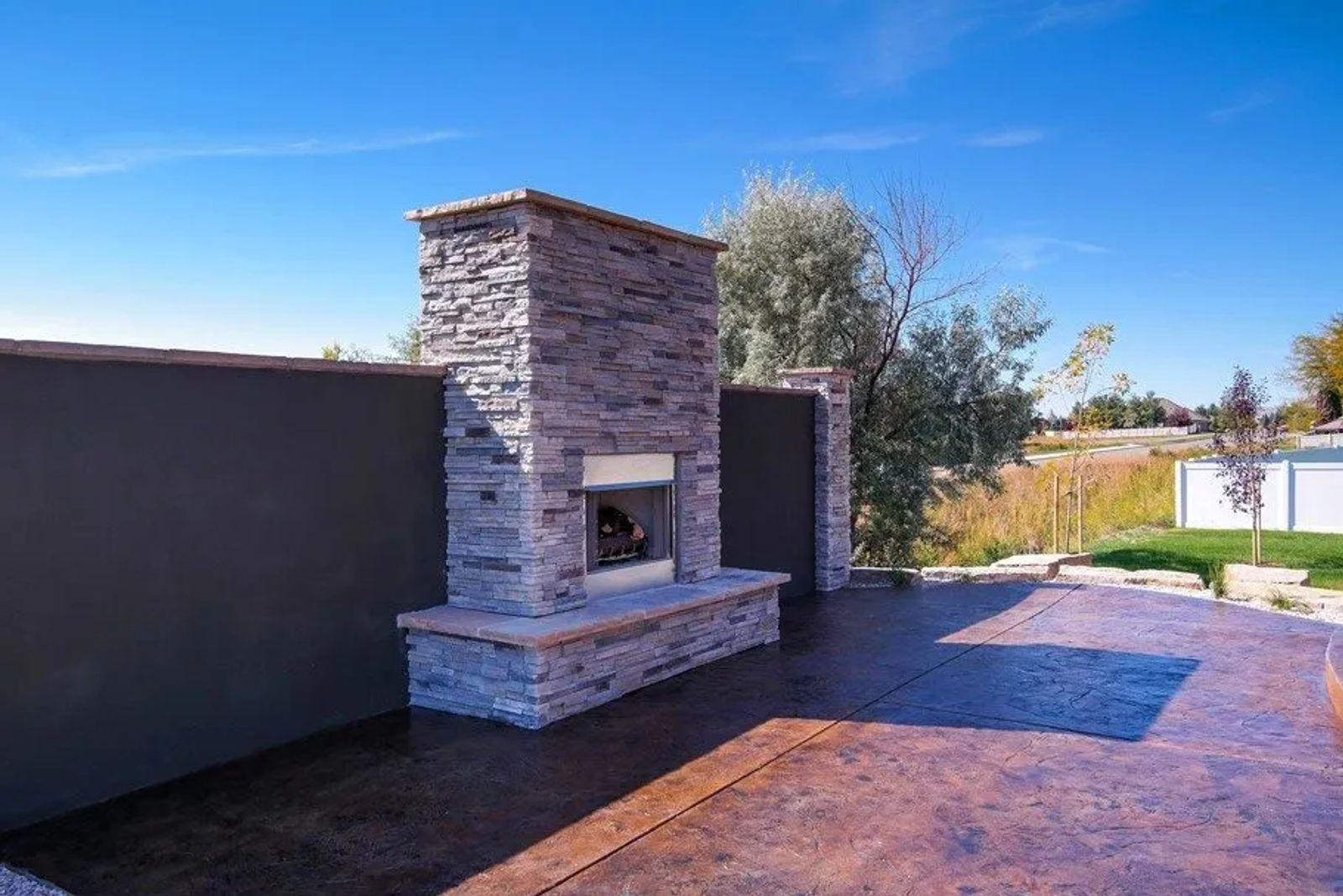 Furthering the alfresco experience, an intimate gathering spot sits separate from the patio. Since the lot borders a ditch, “We built a privacy wall with gas fireplace using the dry-stacked stone for the wall’s end columns,” points out Doug.