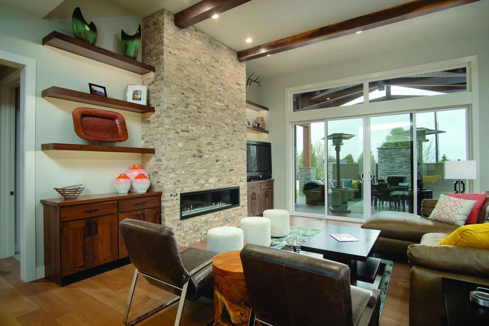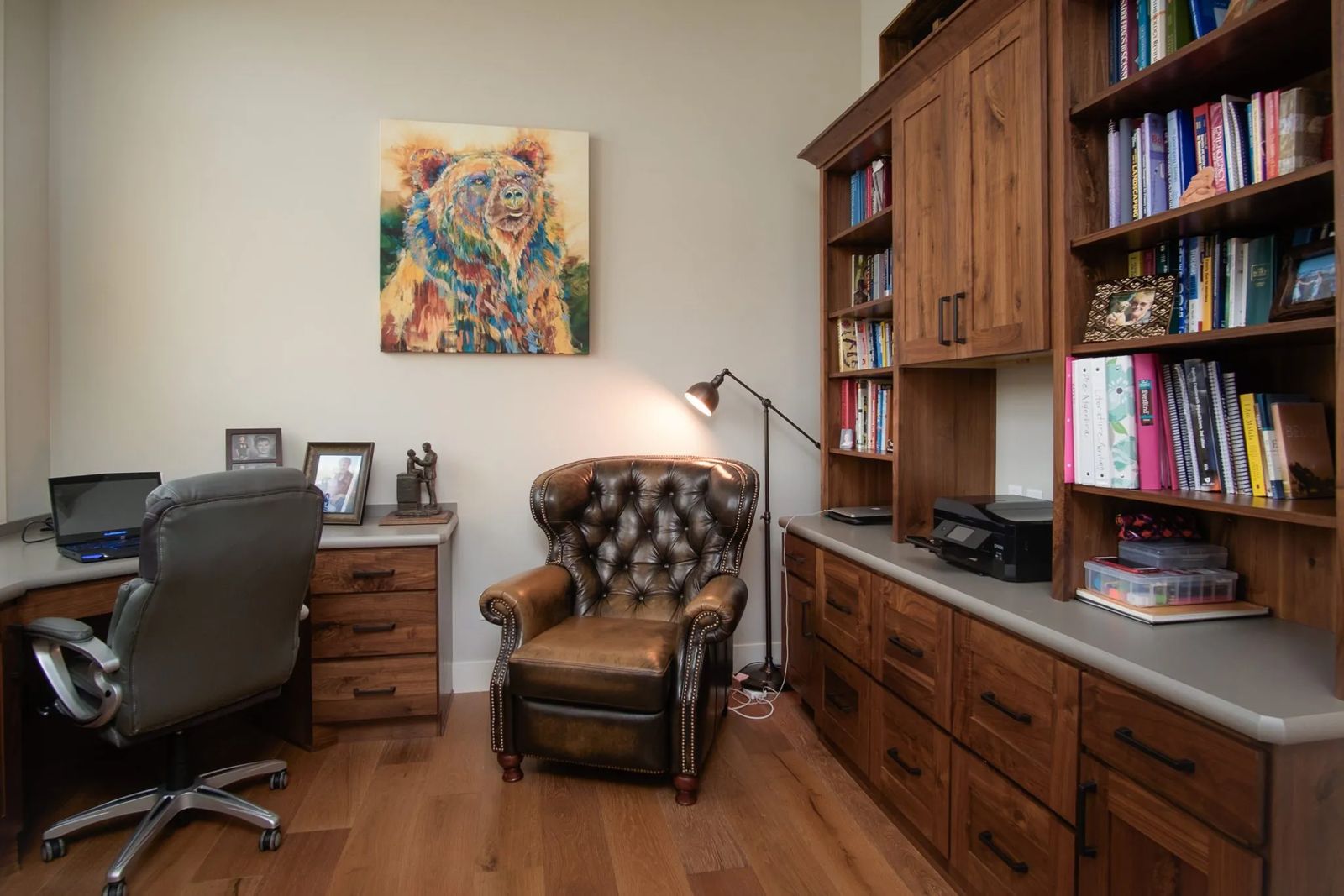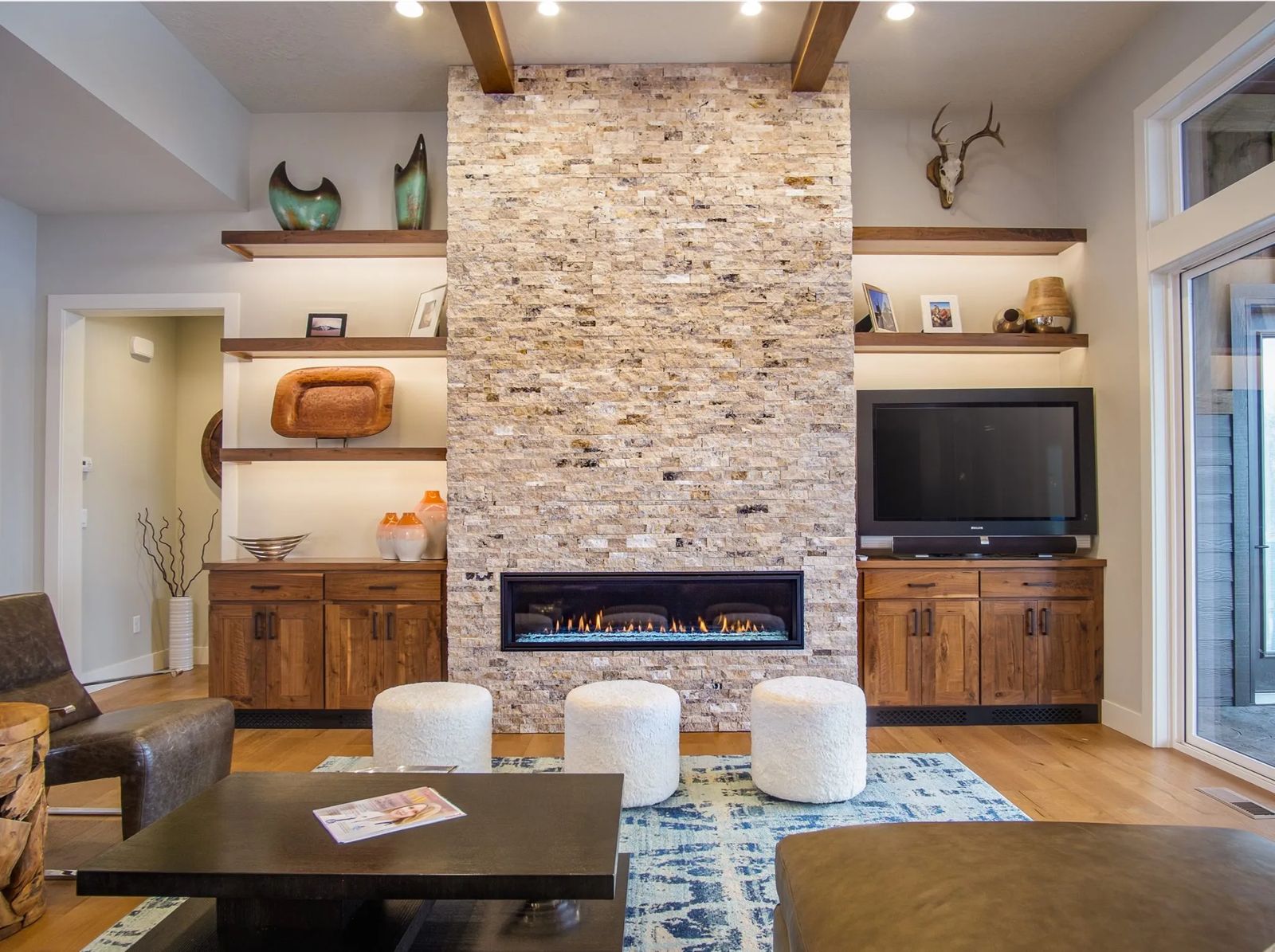 “The floating shelves with LED lighting and built-in cabinets on either side of the fireplace are the same knotty walnut cabinets as in the kitchen,” advises Steve Wylie, co-owner/manager of Rimrock Cabinet Co. “We built the horseshoe-style desk in the front office, as well.”