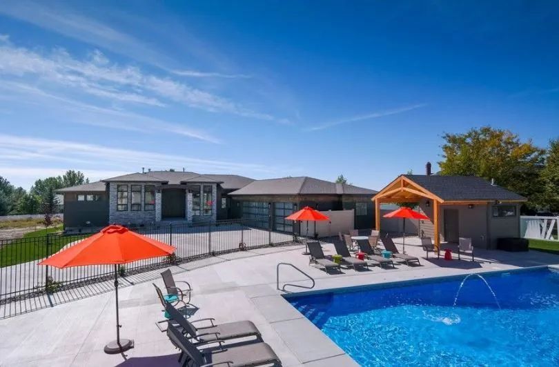 The delightful community pool area includes changing room, bathroom and a gazebo, complete with grill and sink. The pool grounds sit just over the wrought iron fence from the O’Neill’s classy three-car garage.