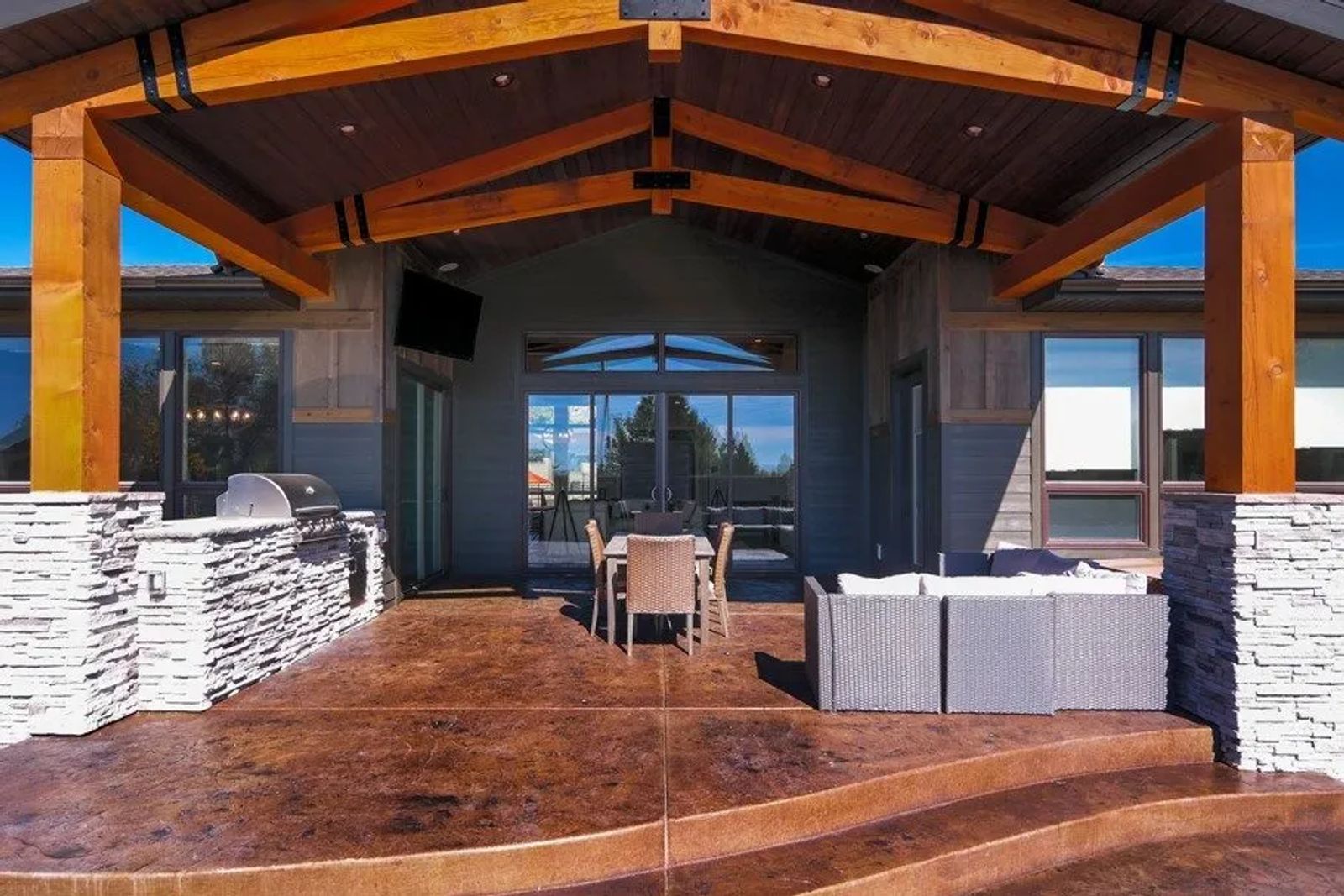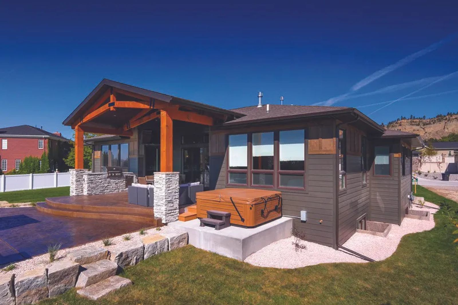 “My husband said, ‘that’s all I want,’” shares Jenny, referring to the outdoor space. “We use it year-round.” The covered patio accommodates a substantial built-in grill, spa, heaters and loads of comfy seating.