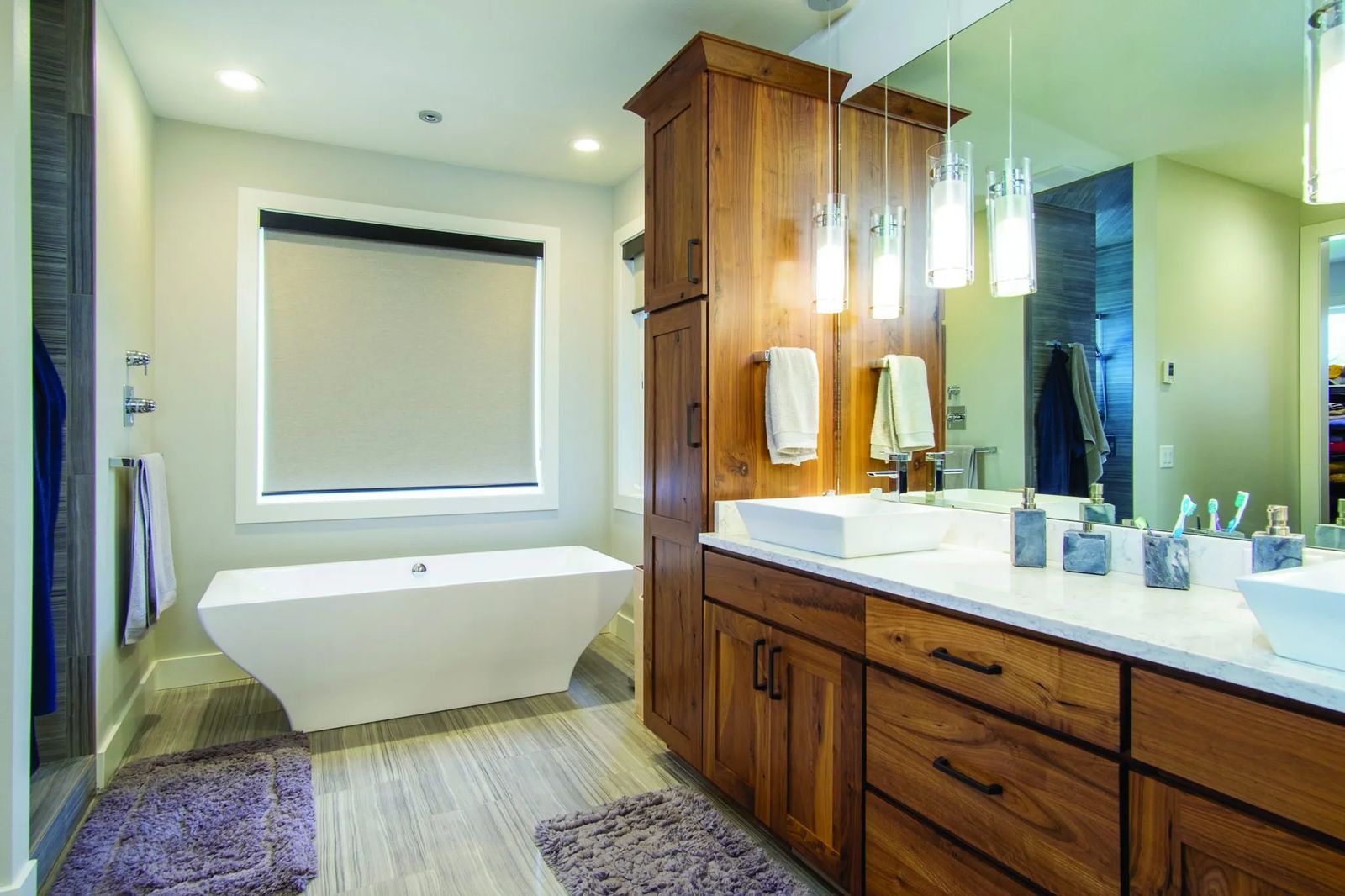 Down the hall, the master bath presents a feast for the eyes. A mammoth soaker tub takes center stage. “It’s beautiful at night,” reflects Jenny. “Water for the tub comes from a faucet in the ceiling.”