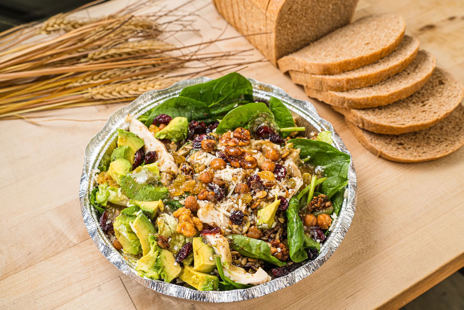 The mixed greens and spinach-based combination features spiced, toasted walnuts and pepitas, roasted chickpeas, craisins, golden raisins, avocado and grated Parmesan cheese, all served with a side of house-made Garlic Lemon Vinaigrette and topped with chunks of grilled chicken. With each bite, there is a mix of salty and sweet, with crunch from the nuts and greens, and savoriness from the chicken.