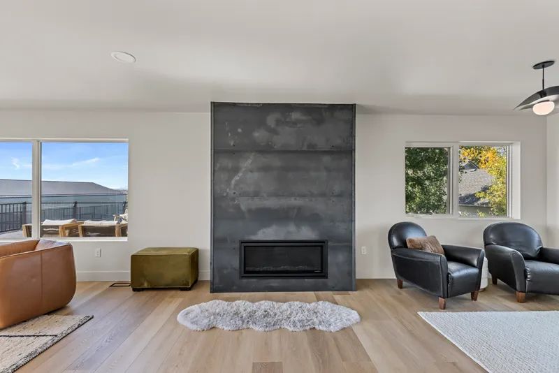 An artistic, one-of-a-kind focal point in the living area is the new fireplace. Jen wanted a large fireplace with a modern overtone.