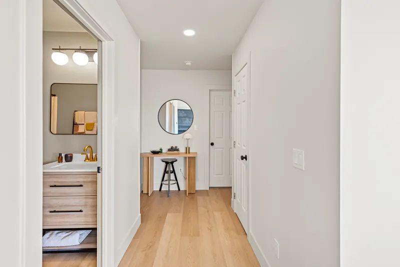 New lustrous LVP Paradigm flooring from ProSource Wholesale, the removal of walls to open up the living space, and the elimination of all the window frames added to the minimalist look throughout.