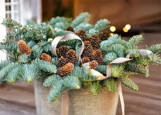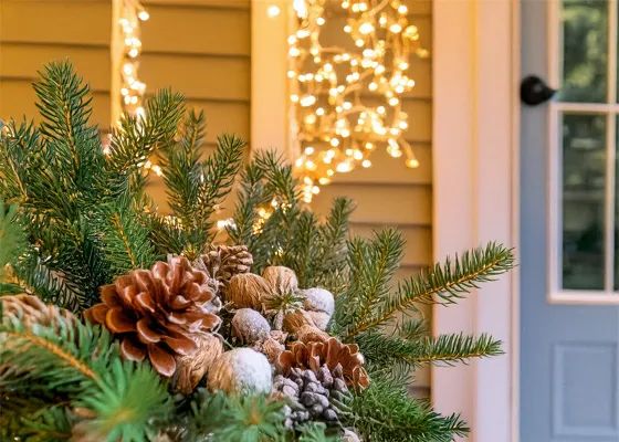 Even the entryway can embrace this softer approach. Swap the pumpkins with something a little more timeless, such as a planter or basket filled with foraged evergreen boughs and touches of decorative branches like curly willow or red-twig dogwood. Create texture with dried grasses, seed pods or pinecones, and add a ribbon in a soft metallic tone for a bit of polish. A strand of fairy lights woven through the arrangement or hung around the doorframe adds a welcoming glow during these shorter days.