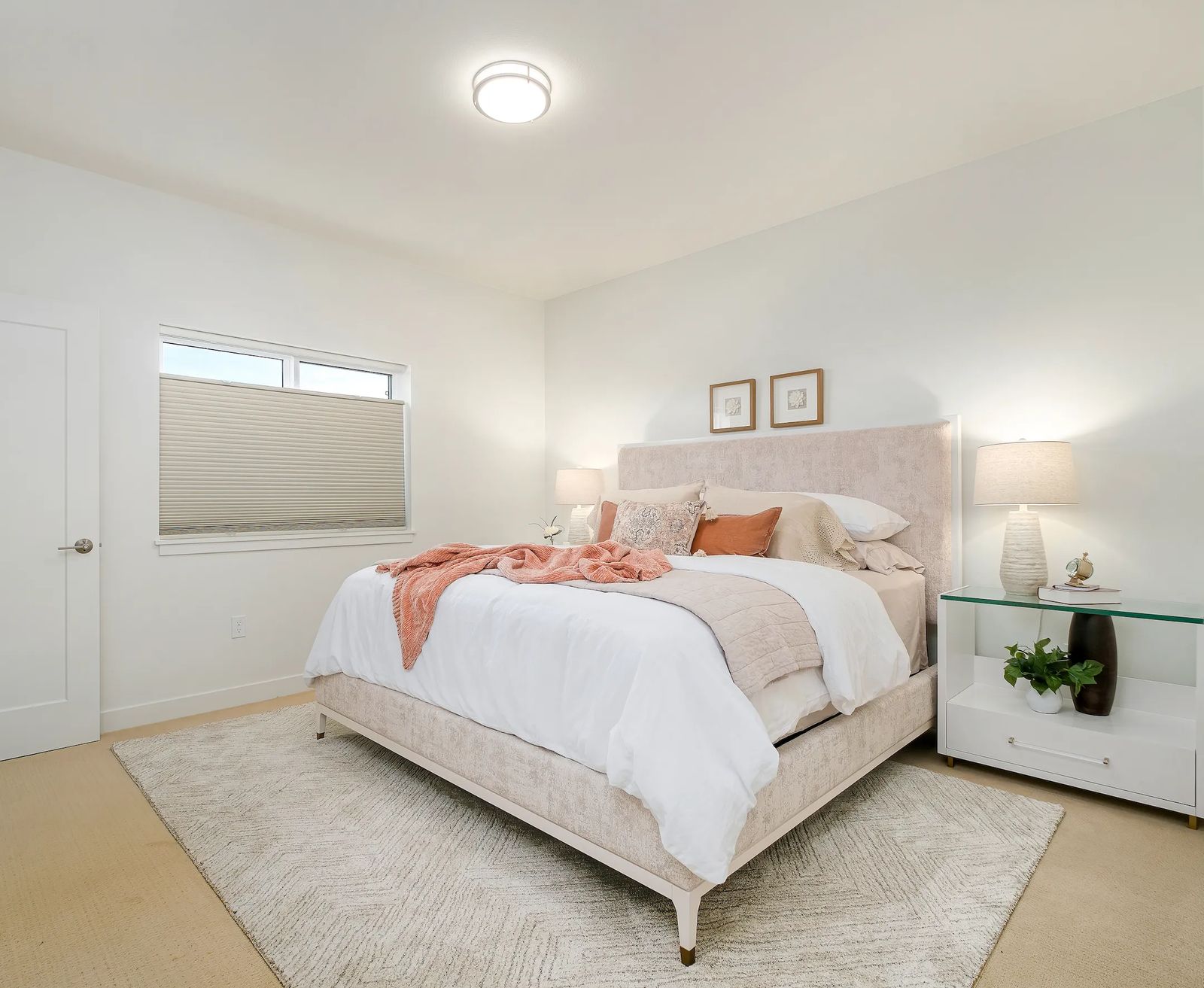 Plush-textured carpeting in a neutral color called Peaceful creates a tranquil ambiance in the bedrooms.