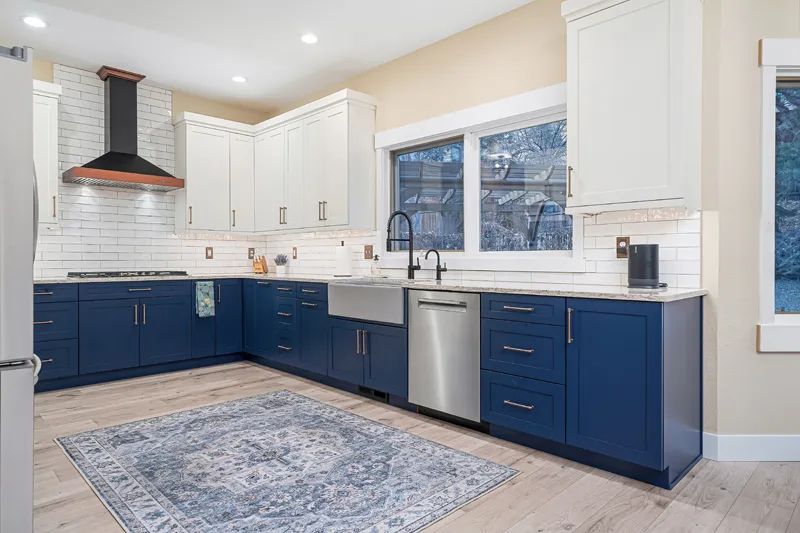 “Navy blue is my favorite color,” Michelle says. “I wanted one stand-out centerpiece in the kitchen and for me that would be the copper vent. It is an oil-rubbed bronze and copper wall mount range hood from Zline Kitchen and Bath. This combo makes me think cozy and relaxing.”