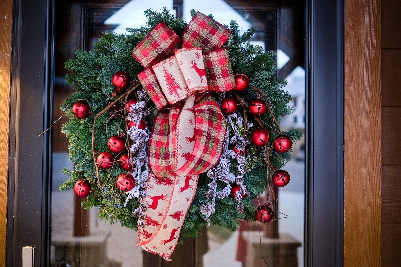 At this doorstep, you could say that the rustic charm has been taken up a notch. Here, you’ll find a wooden bucket filled with berries and bits of evergreen branches with a spray of birch tree limbs serving as a focal point. Instead of flanking the door with two of these arrangements, this look goes asymmetrical with a pair of tables and LED lanterns on the opposite side for a bit of whimsy. The wreath on the door not only offers flocked pine cones dressed up with red jingle bells, but texture is added with printed holiday themed burlap ribbon. It’s a look with texture and interest thanks to some of what nature has to offer — mixed evergreens, pine cones and branches. Call it a look with plenty of Montana charm.