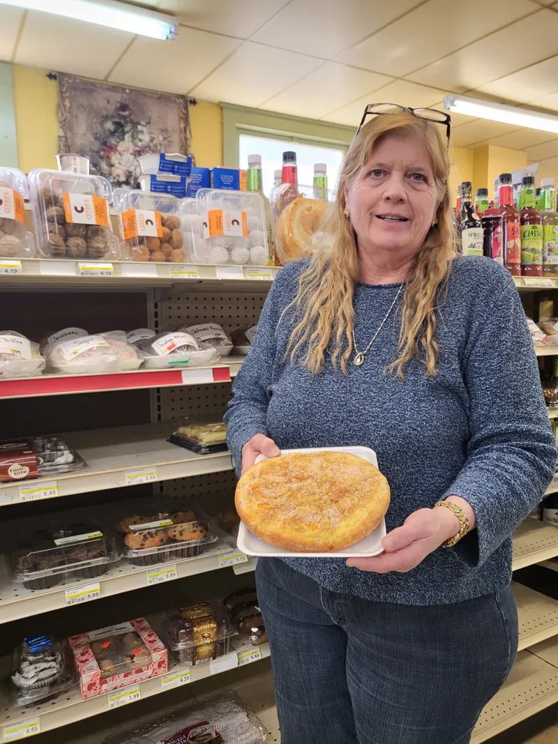 Owner Sharon Self, who bought the market with her husband Don 32 years ago, does all the baking. The original recipe for the kuchen came from the previous German owners. Sharon’s baked goods repertoire consists of “28 cookie varieties. Caramel chocolate chip, oatmeal chocolate chip, Snickerdoodles, Twix. I can bake 4- to 500 dozen cookies a week,” she says.