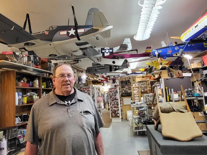 I gasp as I step into the back room. Above the big table providing space for Dale’s upholstery work, my eyes are drawn towards the ceiling covered with radio-controlled model airplanes crafted by Dale. It’s a collection he started more than 50 years ago.