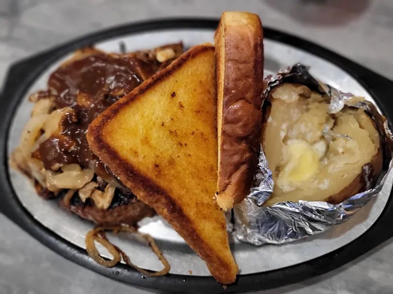 For dinner we drove 10 miles east to the BD Bar in Fallon. We walk into a bar with a live-edged wood counter bordered on one side by a knotty pine trunk. I order the hamburger steak from a menu, which consists of steaks, burgers and pizza. My dish came with brown gravy, Texas toast, a baked potato and a trip to the salad bar. The food was a perfect representation of a sign on the wall of the bar which read, “Gather for Good Food, Good Friends and Good Times.”