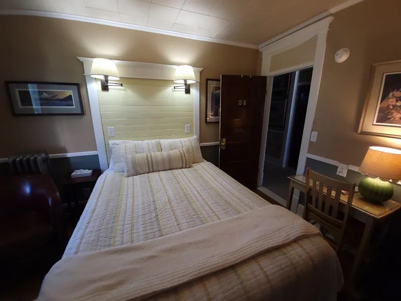 We return to a cozy room at the Kempton. Bryon Birdsall prints of landscapes with snowcapped mountains highlight the space. A yellow clapboard headboard soars over a queen-size bed with pillows and a quilt complementing the wall colors.