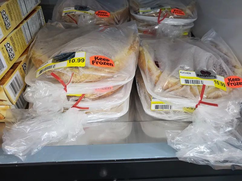 Afterwards, we slide into the Terry Super Valu market to grab a kuchen. On the bottom shelf in a back freezer, the German-inspired pie-like pastry flavored with raspberry, apple, strawberry and other fruits can be found stacked on the bottom shelf.