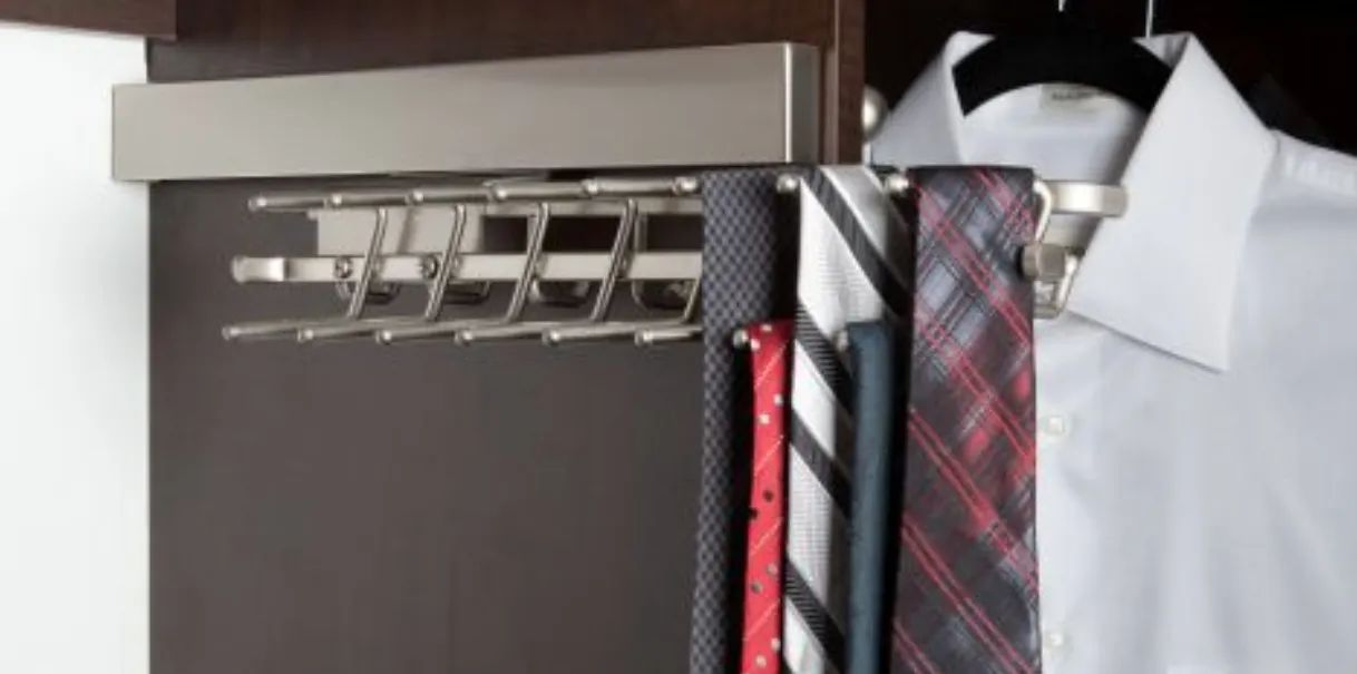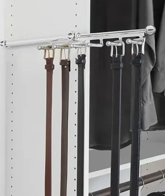 Say goodbye to hanging your belts up on a hanger. This pull-out belt rod is great for keeping your belts organized and all in one spot.