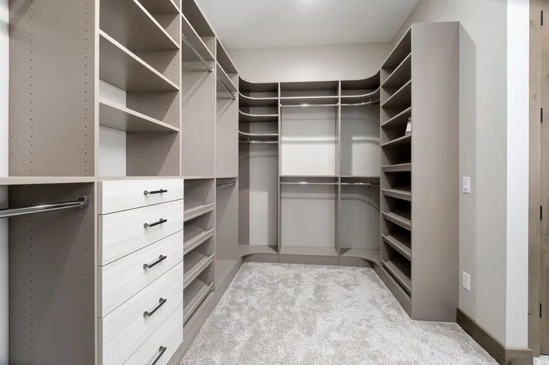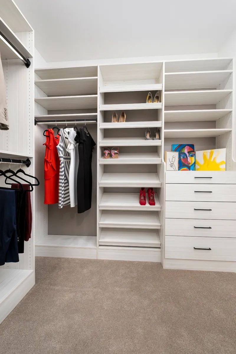 Put clutter out of sight with built in drawers that are perfect for storing underwear, socks and so much more. Having drawers inside your closet space helps keep everything close at hand.