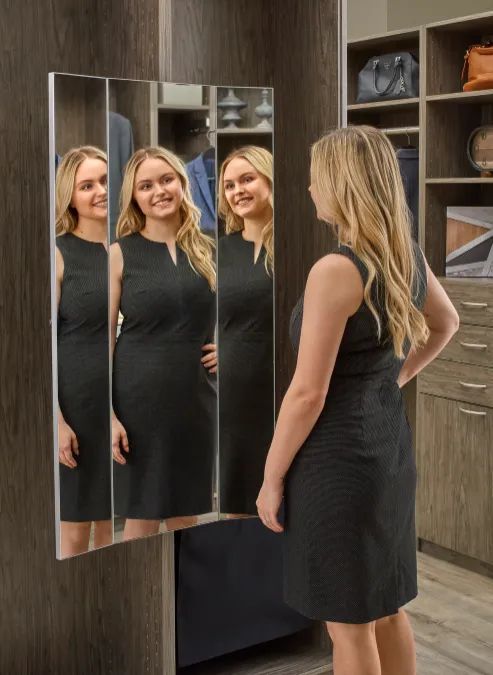 Check out the 3-way soft close closet mirror by Revashelf. It slides out when you need to check out your outfit and then gently slides back into place when you are done.