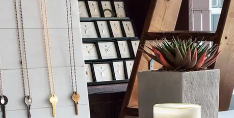 Scout Curated Wares makes jewelry with unique modern designs in gold and silver as well as beaded wrap bracelets made of semiprecious stones. Each stone has a meaning, which is printed on the cards.