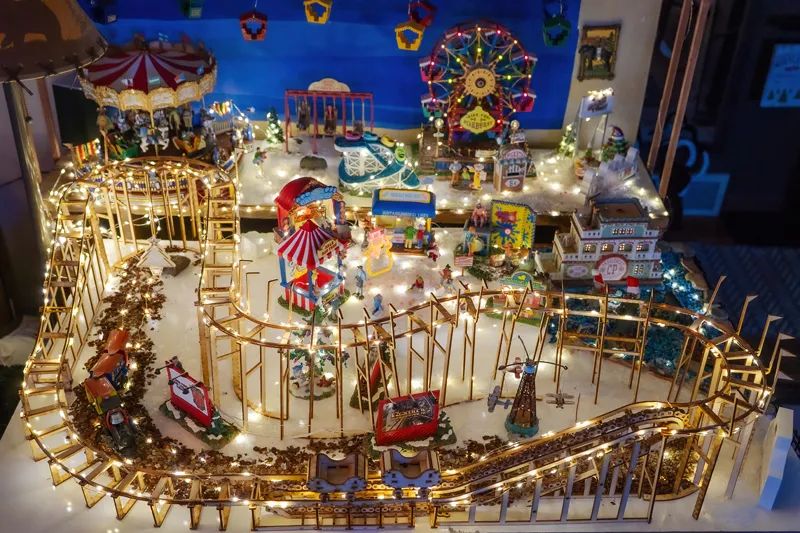 Kari crafted the mini roller coaster by gluing thousands of pieces in the wooden structure together by hand. It took about a month to get it just right, with a lot of hot glue and even more patience.