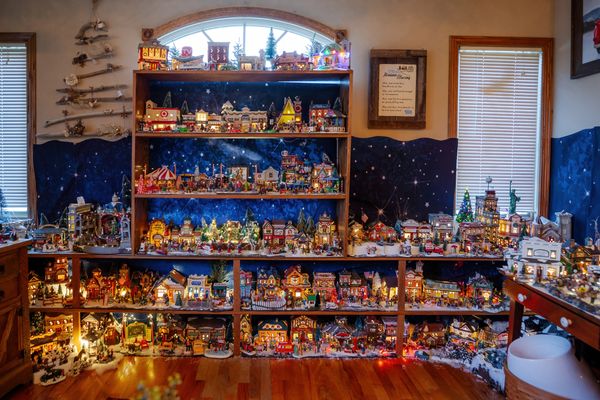 A little before Thanksgiving, the hustle and bustle begin. The storage boxes come out and piece by tiny piece, the village takes shape. When visitors comment about her dwindling space, she laughs and says, “Everybody says that!” That’s why Steve is building a few more shelves to stack above her current display. “One shelf will hold 18 more houses,” she says excitedly.