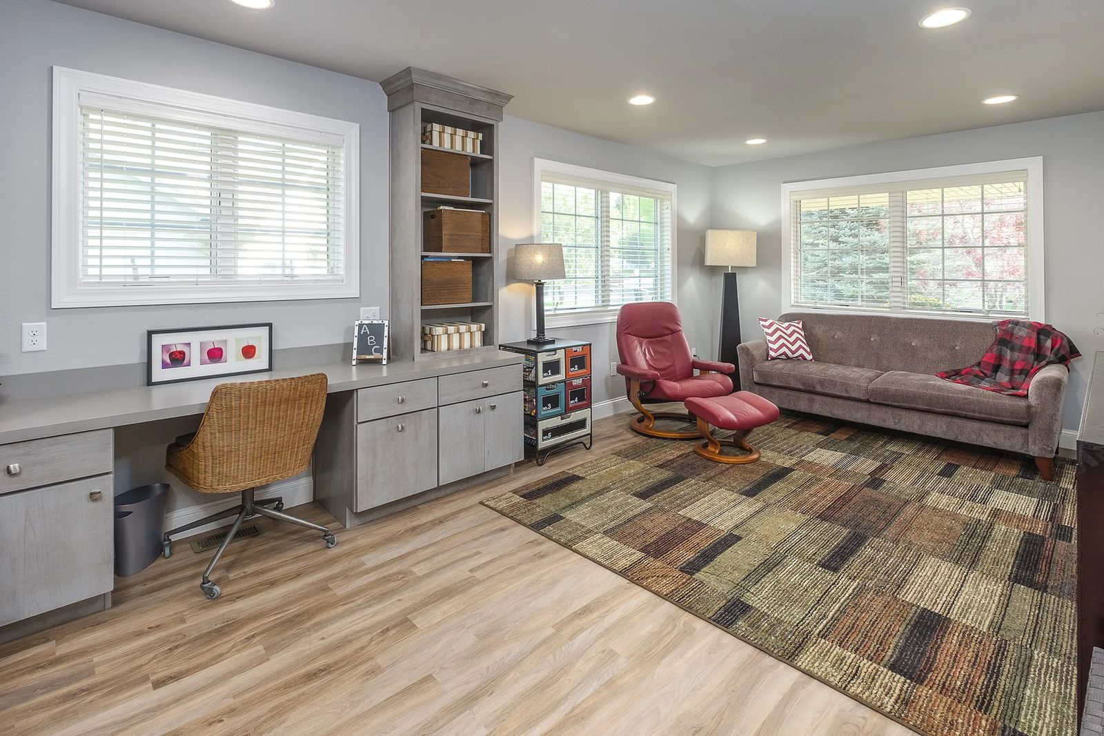 Furthering the uniqueness of this contemporary renovation, a built-in office space with Medallion peppercorn-colored cabinets takes up minimal room. It's perfectly tucked in on the living room side, providing Barb the ideal place to prepare her class work. Even though she's retired from teaching, she continues tutoring dyslexic kids.