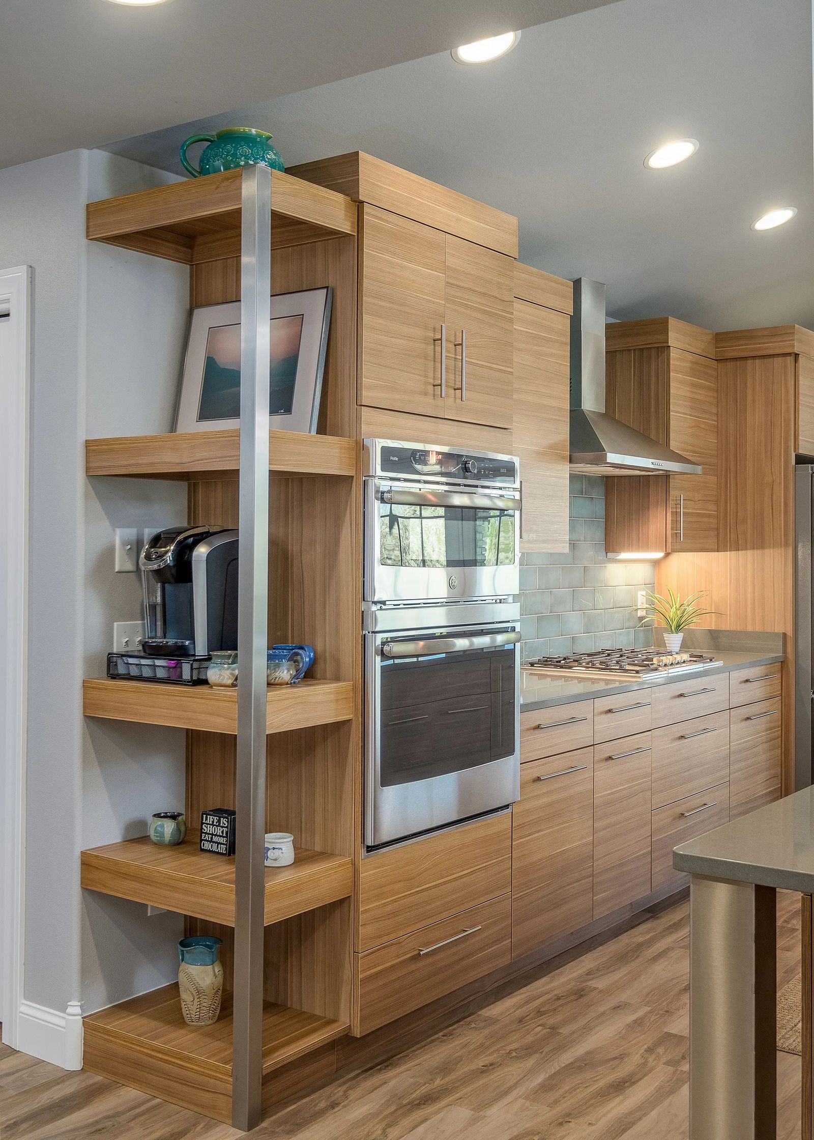 Stainless shelving on one end adds a decorative element to the cabinet wall. "When coming in the front door," Jeremy says, "this is a focal point, not just a cabinet door." The shelving adds sophistication and gives Barb and Scott easy access to the Keurig coffee machine while keeping it off the countertops.