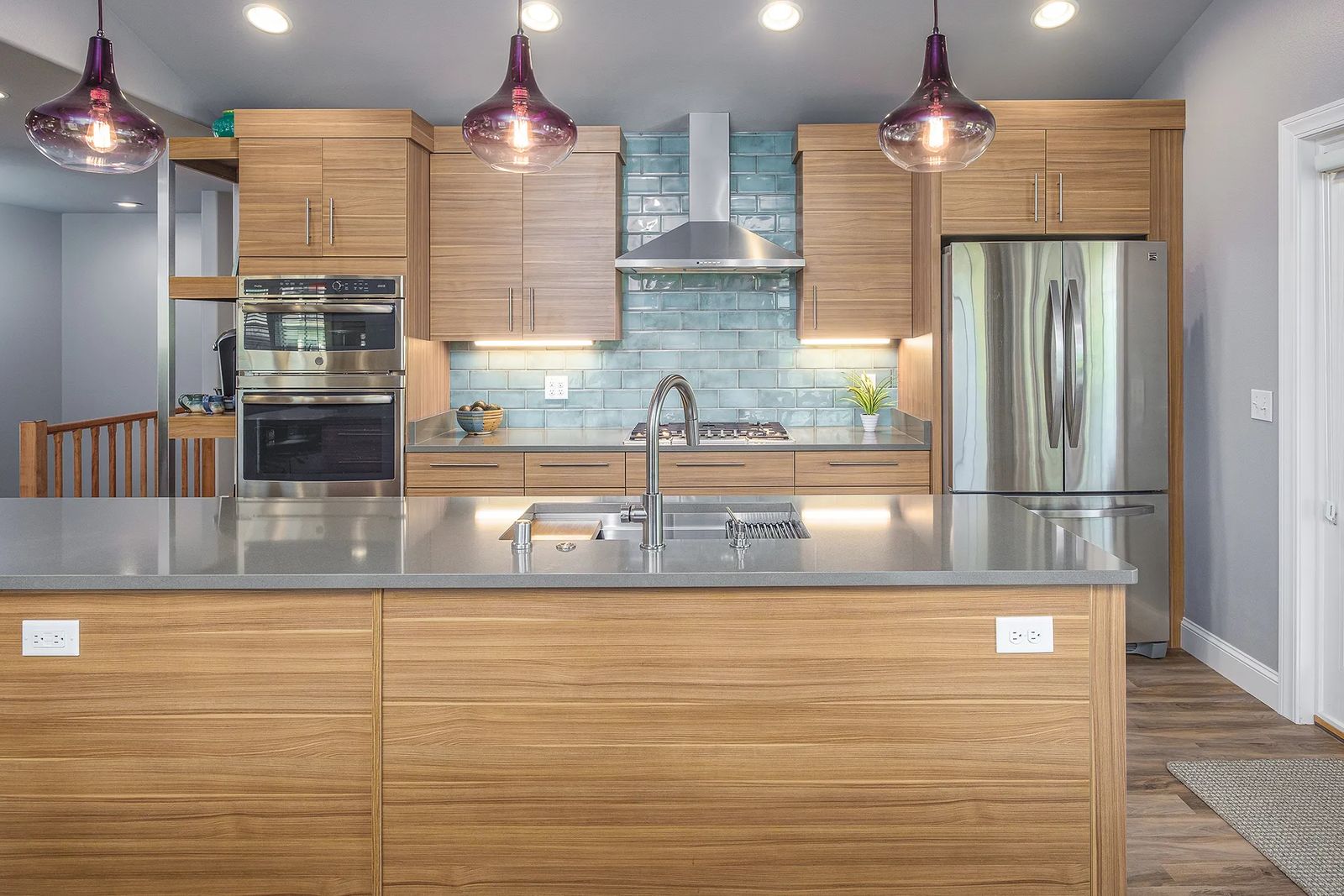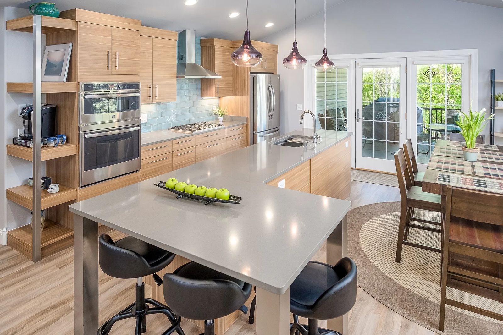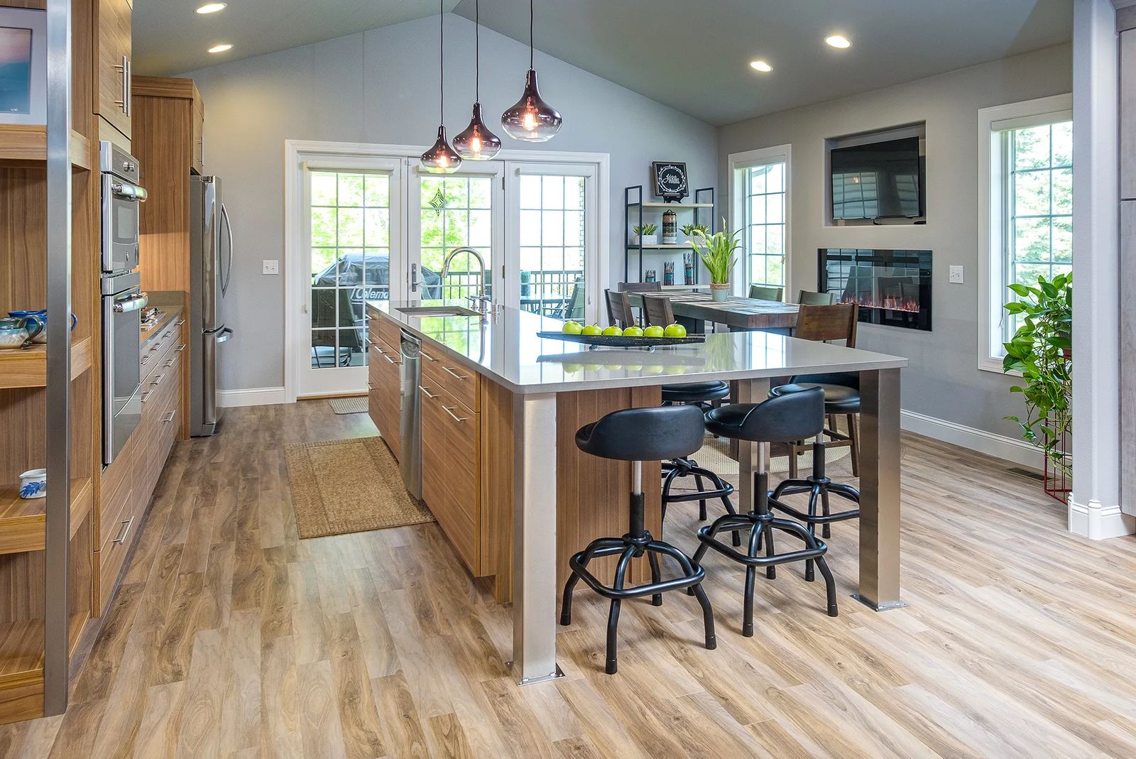 The new gourmet kitchen shows off high-end custom cabinets, from Cyrstal Cabinet Works, with wood grain fronts that run horizontally on the upper cabinets, offering a clean modern line.