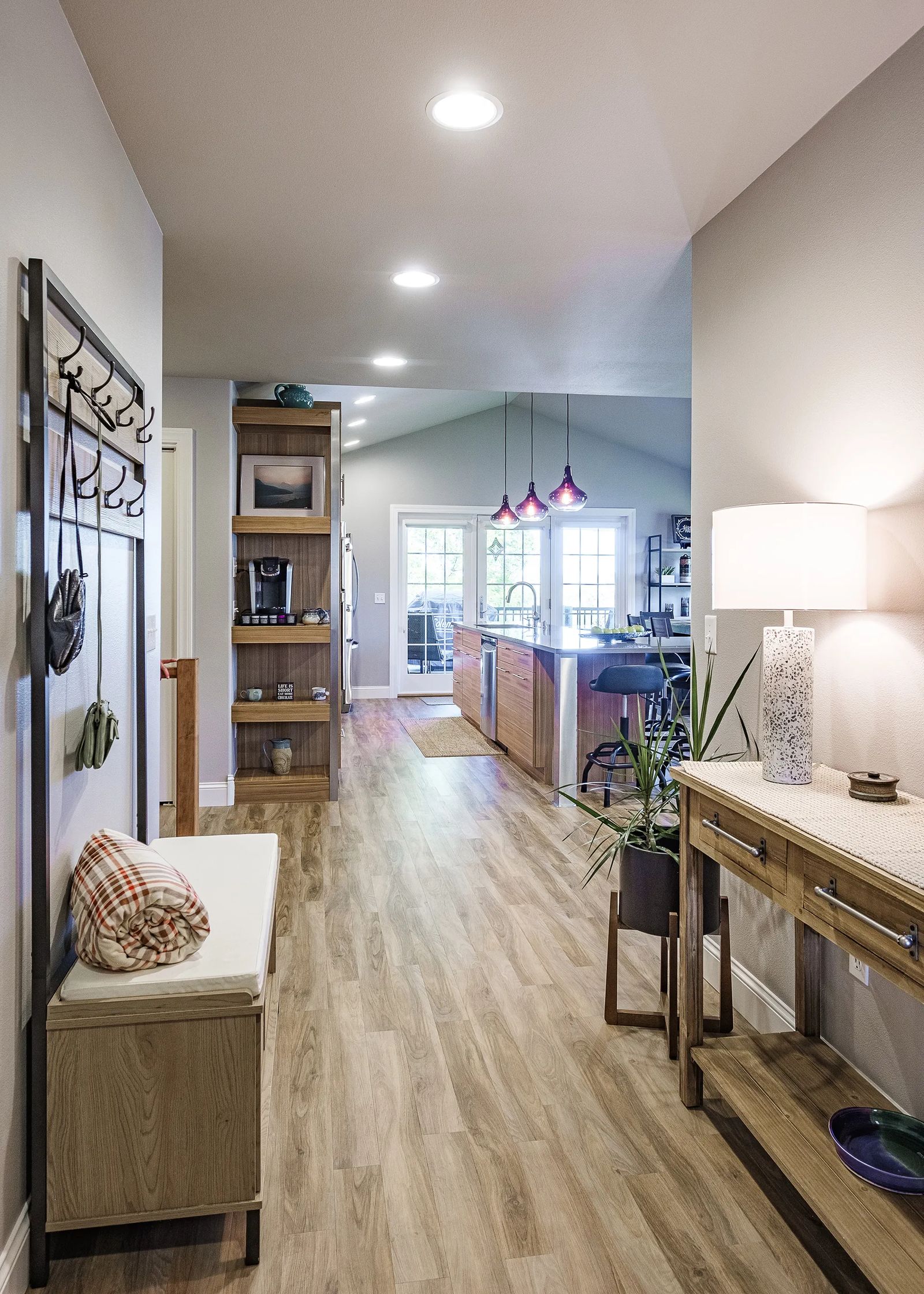 An archway near the front entry that led into the old kitchen was done away with, presenting the new living room with a touch of privacy when someone's watching TV. Without the archway, the space now flows into the heart of the home.