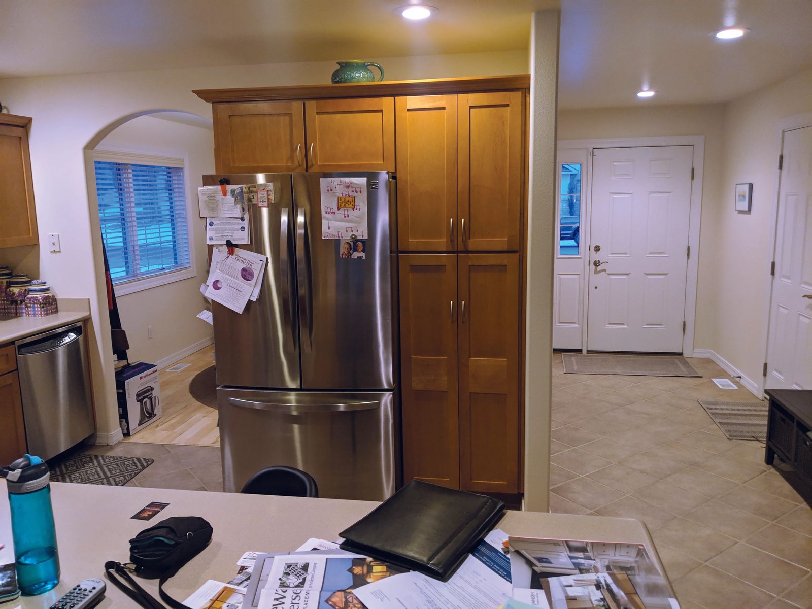 "The kitchen now," says Jeremy, "was the living room. It had a TV on the wall, which is where the stove is now. There was a floor-level gas fireplace with mantle and now it's a linear electric fireplace placed flush on the southeast wall under the TV. It's sleek and contemporary looking. And, you can now go from the kitchen out to the back deck."