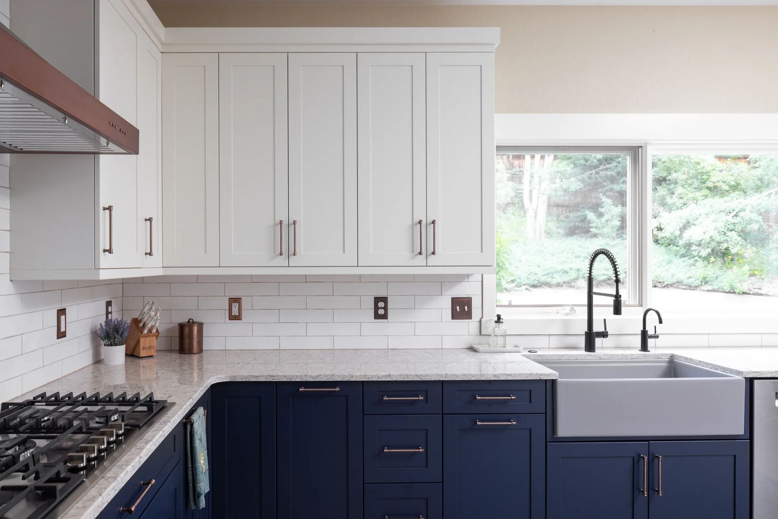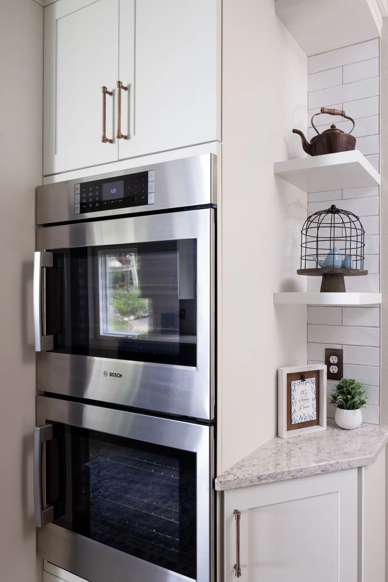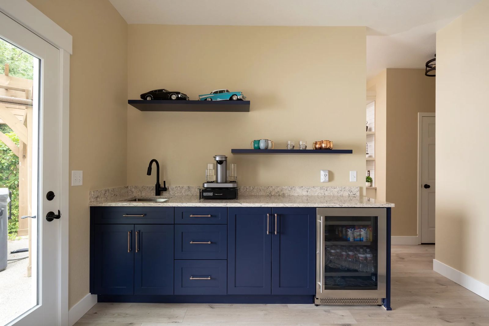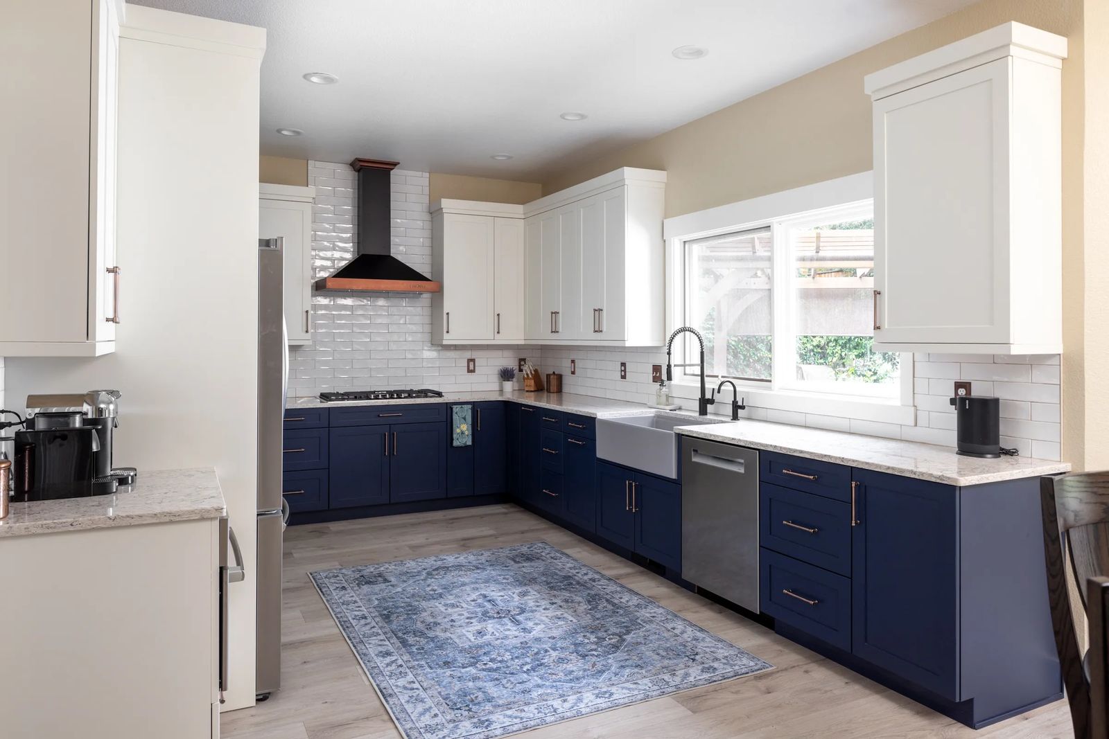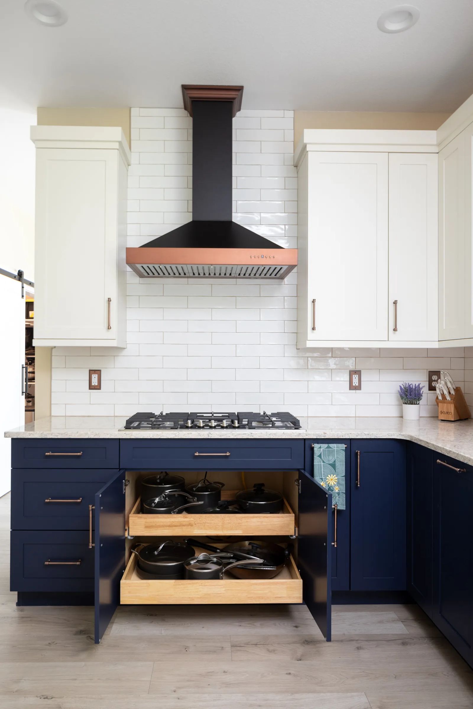 When this homeowner approached Emily, she had one goal -- to change the way her kitchen functioned. "She originally had a peninsula and a tight walkway between it and her fridge. She never used the peninsula and not only wanted better function with her cabinets but she needed a pantry." Emily gave the kitchen a whole new contemporary vibe with better storage, floating shelves, a beverage center and a more open layout. The navy and cream design also made this renovation very on trend.