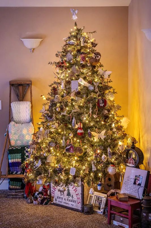 Nana’s Tree belongs to Lorene Oswald McCarthy. “This was her house,” Julie says, about her grandmother, “and the tree is covered in all the ornaments she loved. Three of them are from when she was a little girl. She loved butterflies, birds, deer, and she loved owls. She loved angels. She’s definitely our angel!