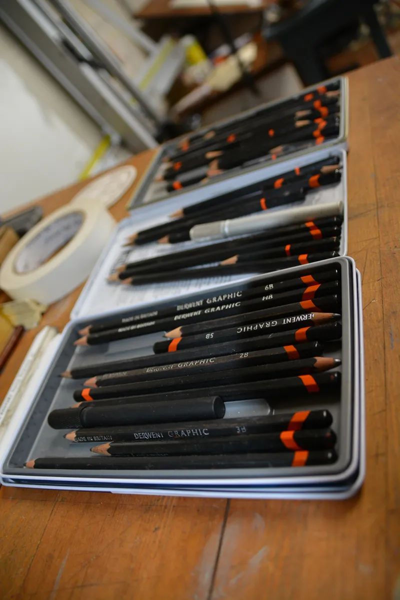 Dale aspired to be a painter but made the shift to pencil at the encouragement of a professor during her senior year of college. She still enjoys painting when she can. In her studio, an unfinished oil painting of butterflies sits on an easel with a jar of brushes nearby.