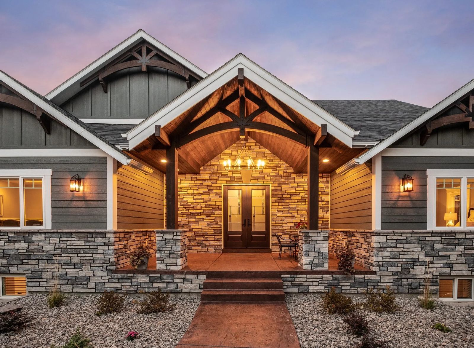 “The front entry had an old pergola look,” Jeremy points out, as we stand outside the newly reconstructed house. “So we took that out. The roof pitch is now steeper and we added two gables.” The front looks entirely different, with six rustic trusses now providing a 16-foot grand entrance to this magnificently redone home.