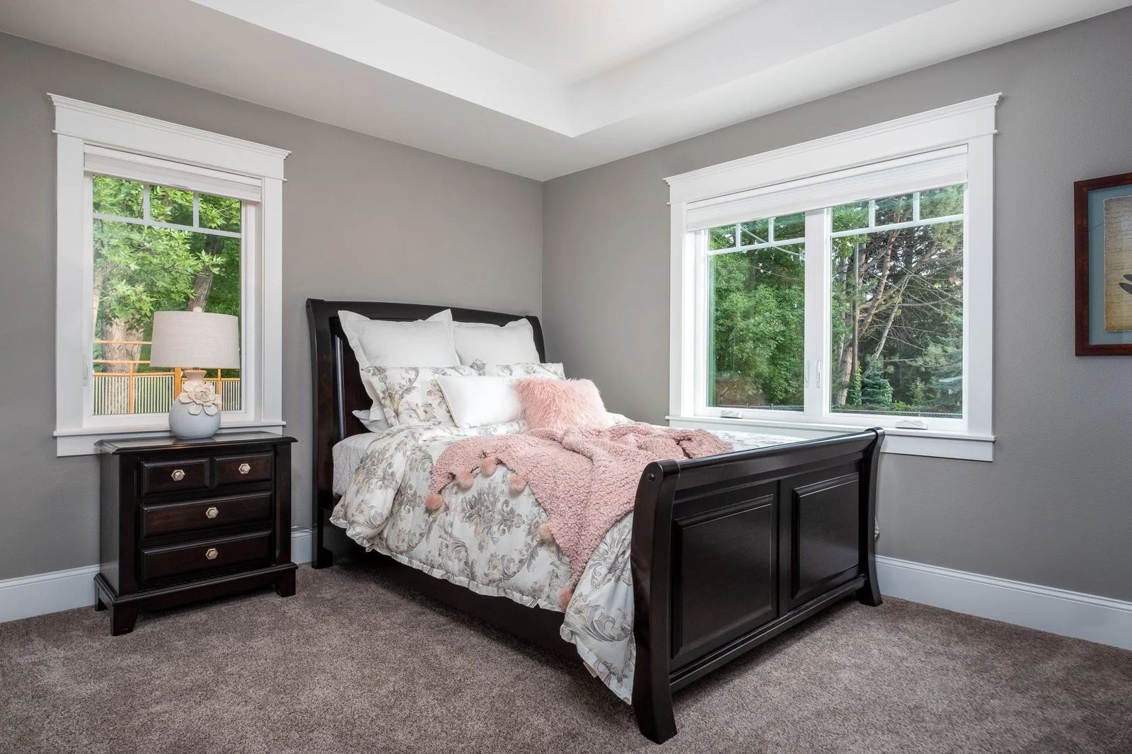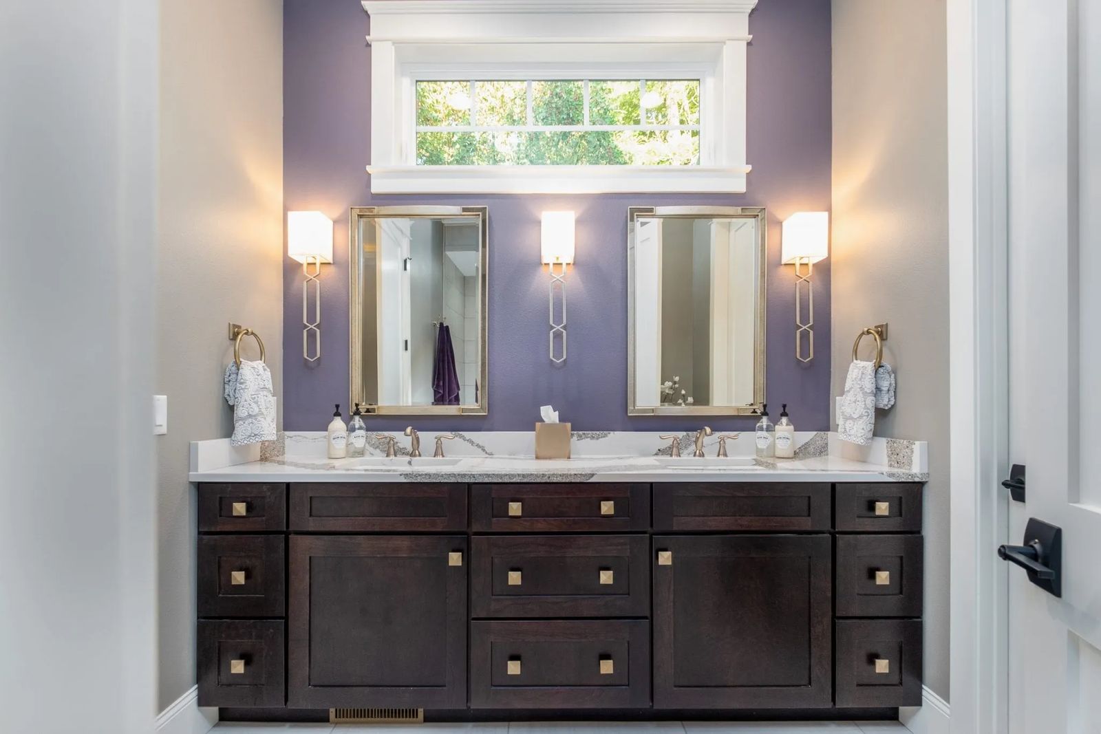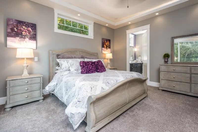 The en-suite exudes classiness as well. A double sink quartz vanity of gold and silver shimmers with purple flecks as the plum-colored wall exudes a bit of chic glamor. A large transom window above the vanity lends extra character to this modern bath, as does the tiled walk-in shower with a linear drain.