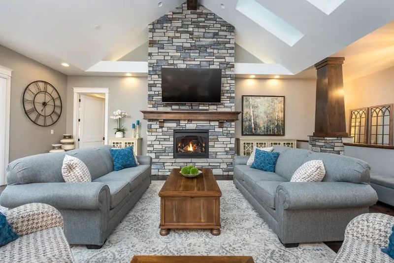 The large living space boasts a vaulted ceiling with a majestic rock fireplace surging up amid warm gray-colored walls. Soffit lighting highlights the height of the fireplace while softening its masculine structure. A 75-inch flat screen fits snuggly against the rock above the mantle, and three skylights with remote control shades are stationed above.