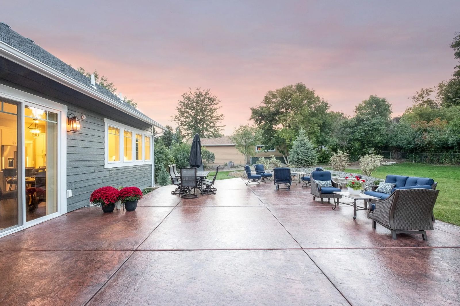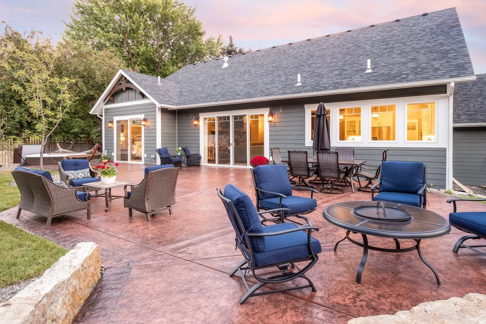 Standing at the white farmhouse sink, the view takes in impressive landscaping recently done. Step out through eight-foot double sliding glass doors and you’re surrounded by a park-like oasis filled with fresh plants, shrubs, rock gardens, mature trees and a large stained-concrete patio.