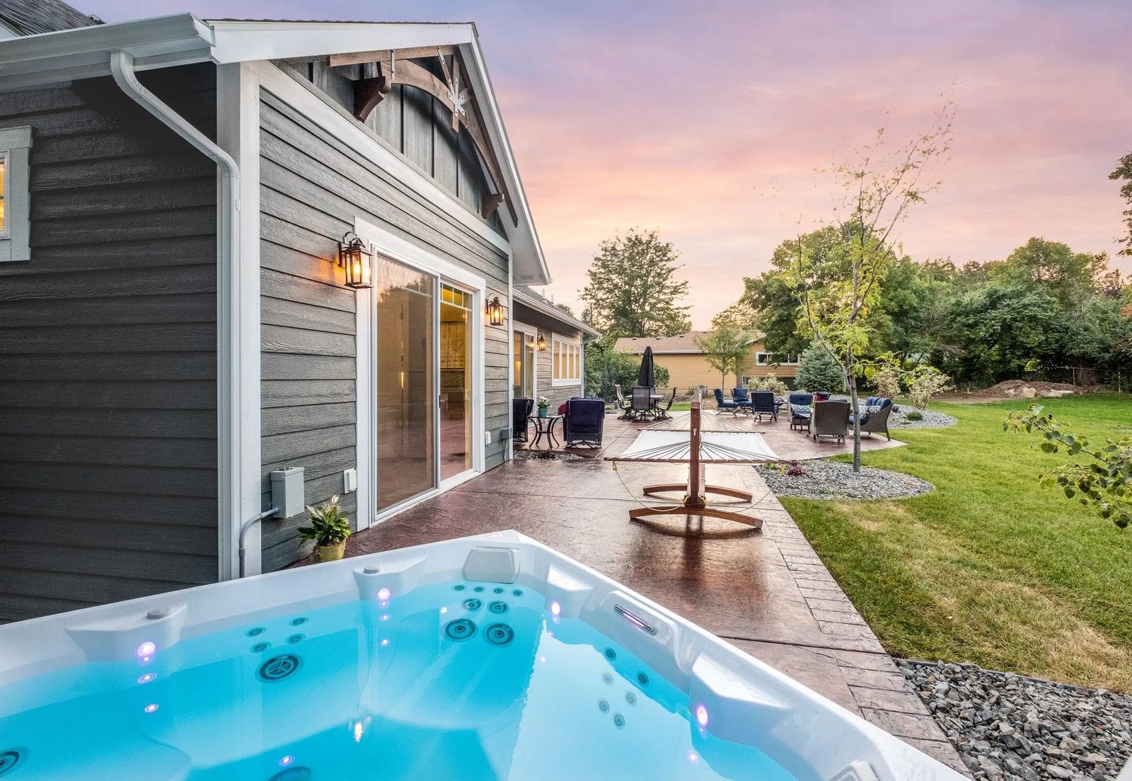 Off to the side of the patio sits a sunken salt water spa from Montana Hot Springs Spa. A separate sliding glass door just steps from the spa allows Angie and Jeremy to come and go from their master suite.