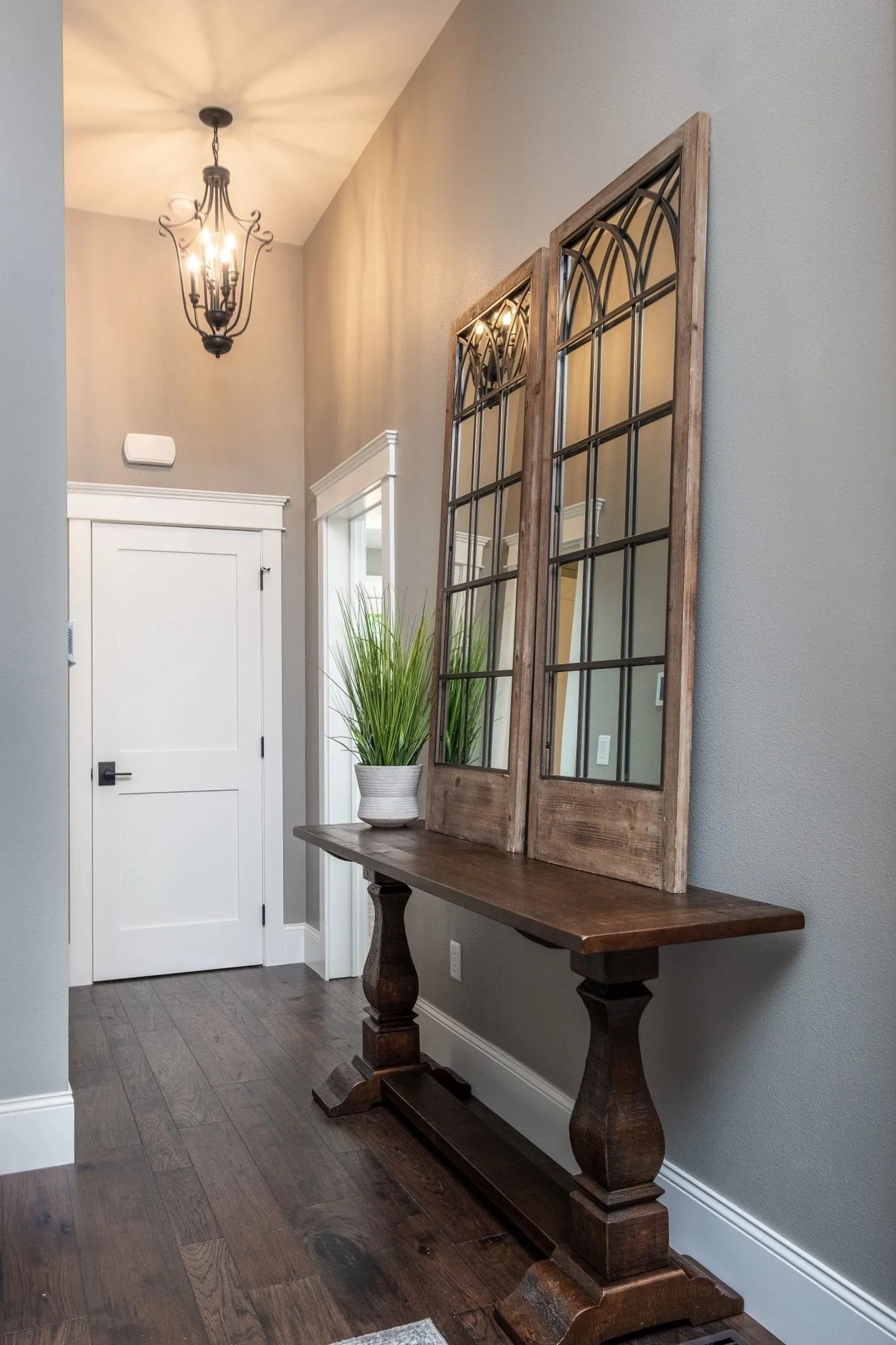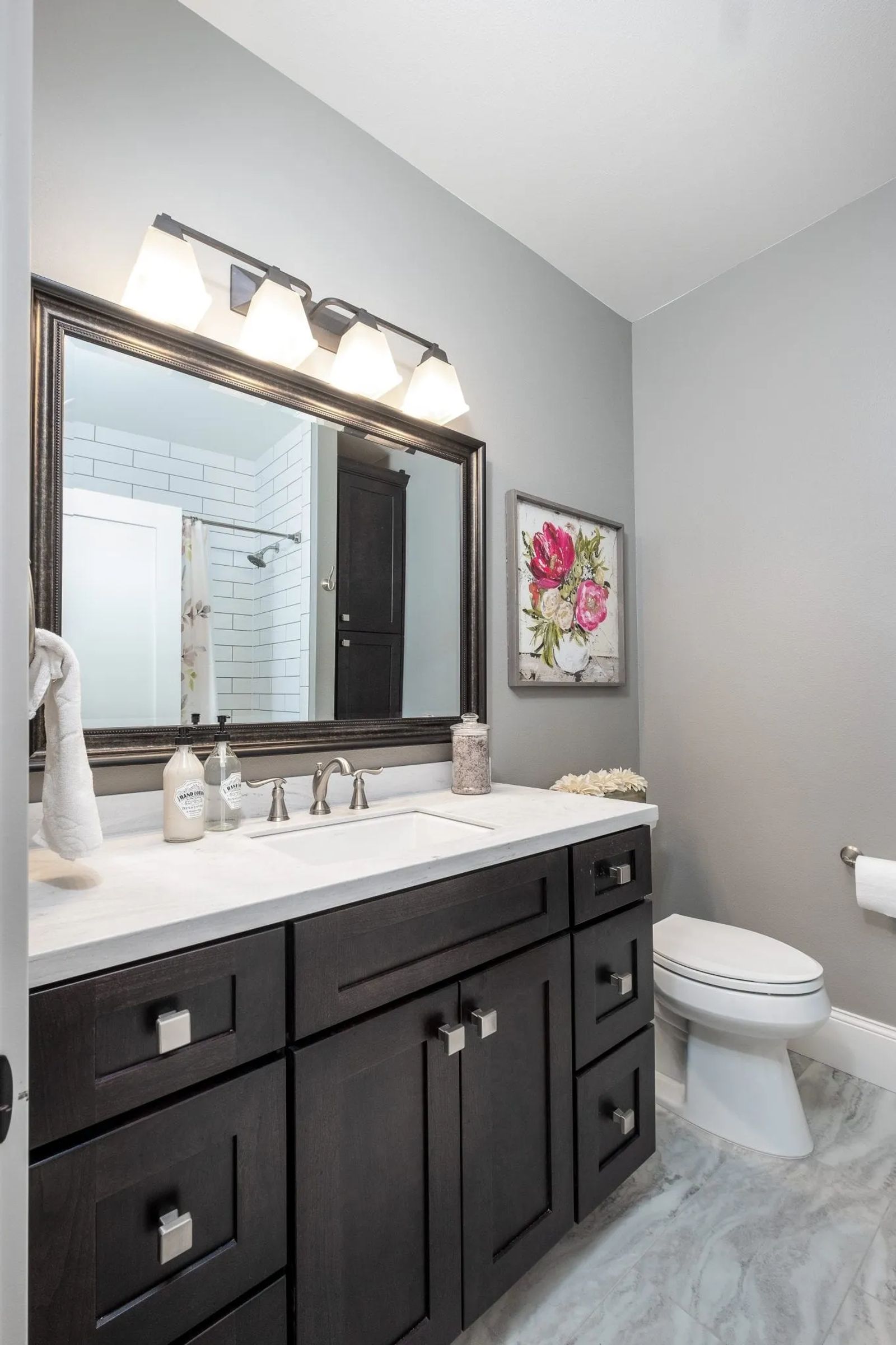 The colossal front door opens into an 11-foot-high foyer. A half wall complete with three columns rocked half way up gives separation to the great room. At one end of the foyer is a totally redone guest bedroom with an illuminated tray ceiling. Across the hall, a “run-down” old bathroom is now finely furnished with a large subway-tiled shower, tiled floor and all new fixtures.