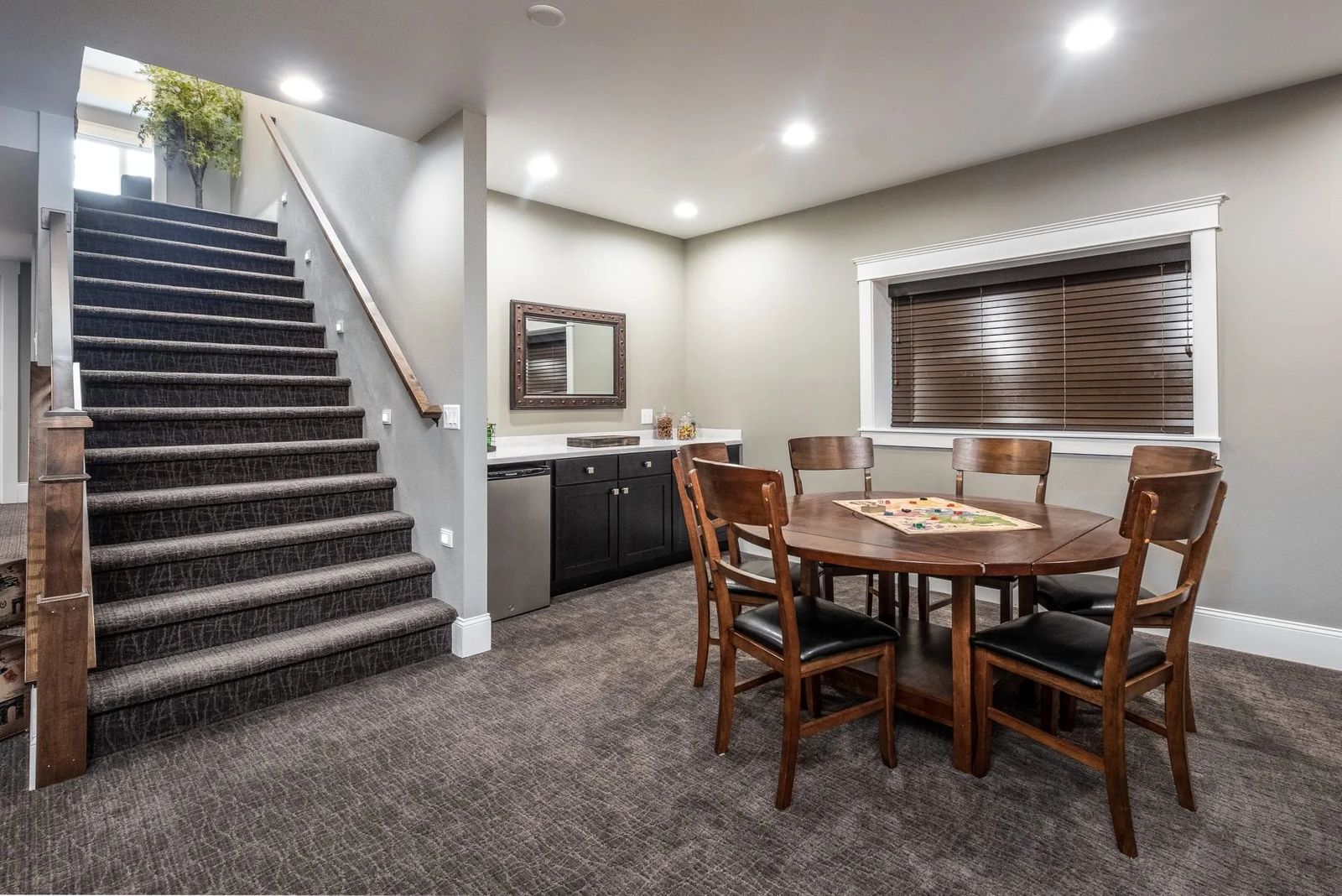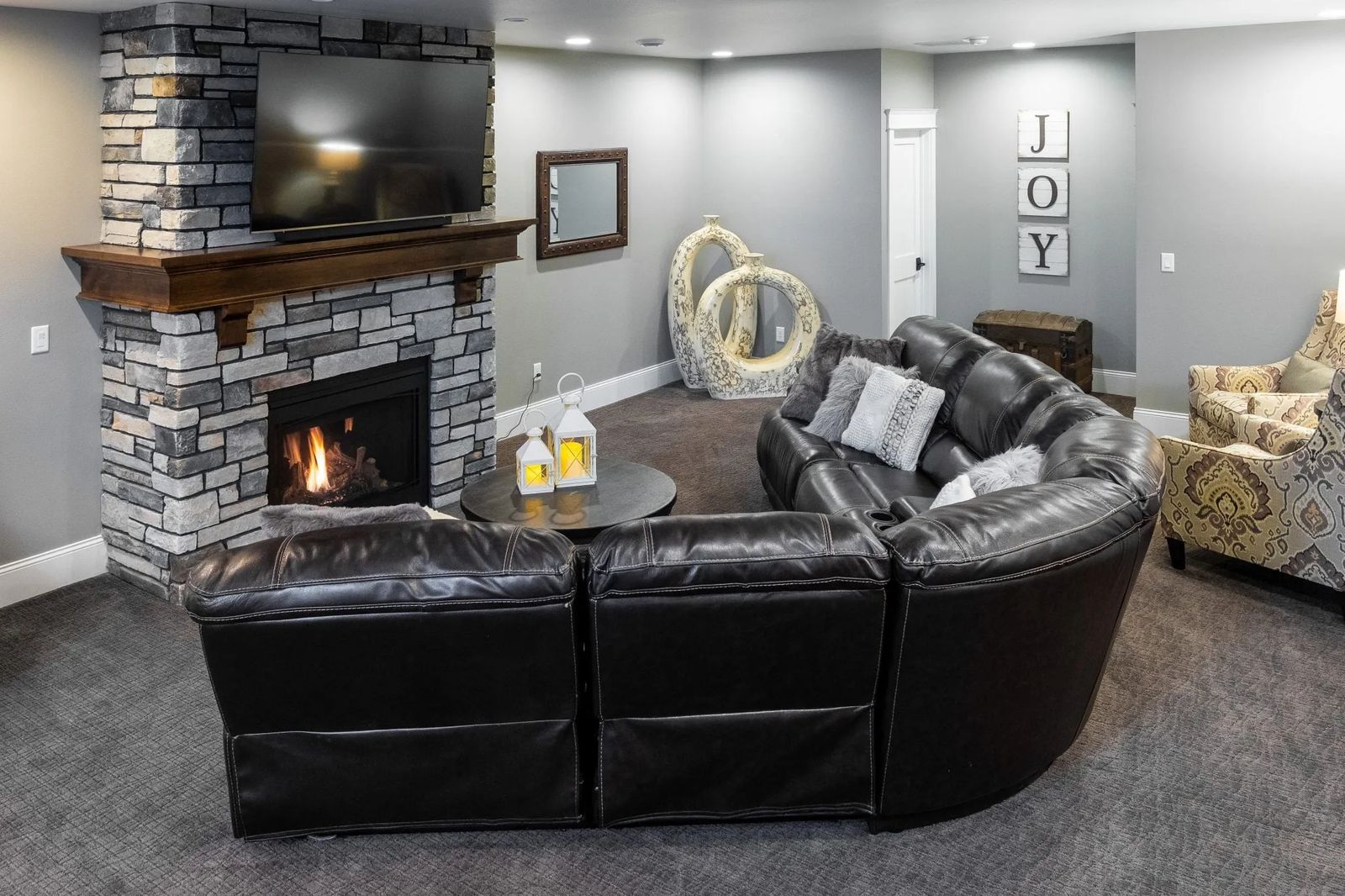 The roominess of the basement gives way to large egress windows, allowing in natural light. A large rock fireplace plays host to a flat screen TV that can be observed from any seat on the substantial sectional. A game table sets next to a window and a pool table is on the agenda.