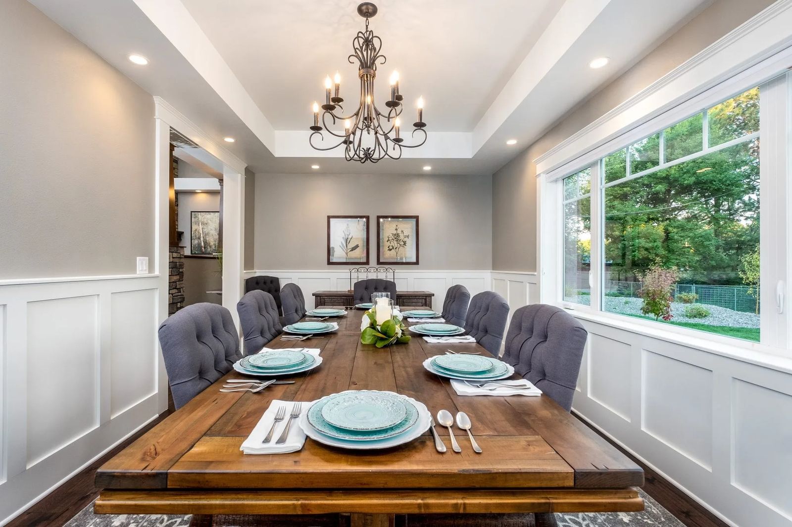 Both spaces are part of the original structure, as is the formal dining room at the other end of the foyer. This divine dining room features a lighted tray ceiling, custom wainscoting and a view to the newly manicured front yard. “This room used to be the living room,” Jeremy notes.