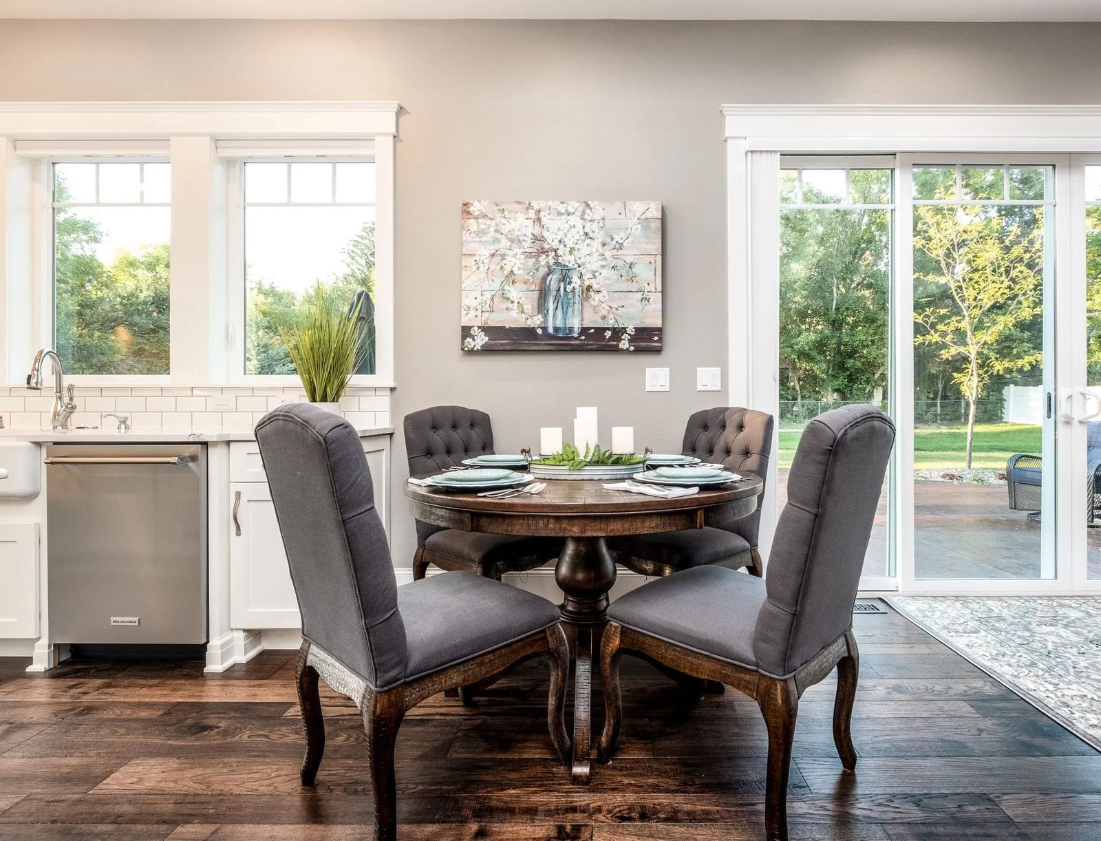 The furniture choices pair well with medium-to-dark engineered Gaucho Monterey hickory flooring from Floors by Design. The rich wood flows throughout the main floors. The bedrooms, however, are carpeted and the bathrooms are tiled. Lush carpeting also covers the relocated and widened staircase, as well as the entire downstairs area.