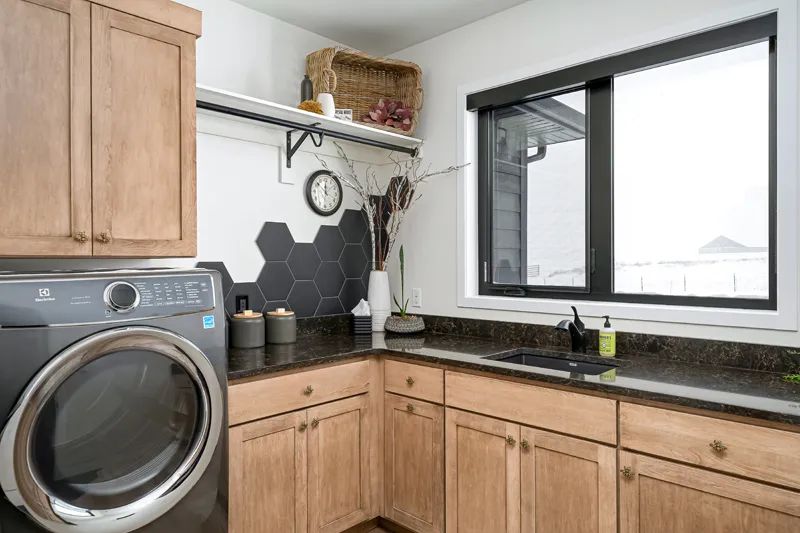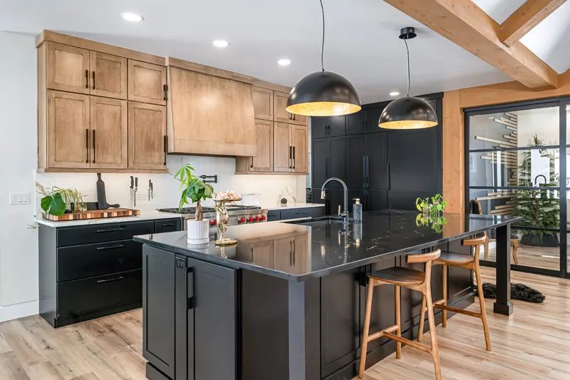 Jake Nienaber, owner of Zuhaus Construction; Ellie Lowe, coordinator of Zuhaus Interiors; and Jason Loyning of JL Kitchens by Home Yellowstone, collaborated with Sheila to realize her vision of blending a love of black with lighter wood tones, spacious rooms and an elegant yet relaxed design throughout, something that made their home distinctive.