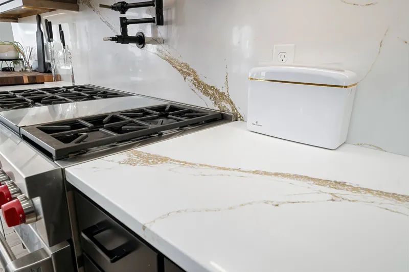 “The lower kitchen cabinets were built two inches taller for ease of use for the Collishaws, so we adjusted the height of the Maple, silver-umber upper cabinets as well,” Jason says.