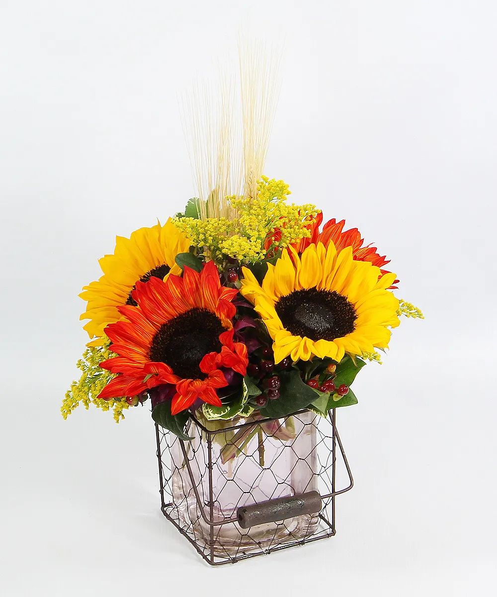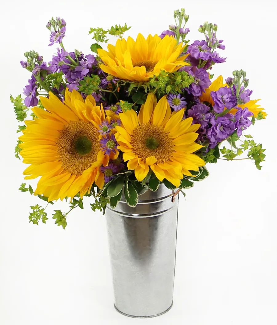 - Colorful Combinations: Pair sunflowers with other red, orange or yellow flowers like roses, snapdragons, or chrysanthemums for a bold, colorful arrangement. For a striking contrast, mix them with blue or purple flowers like iris, liatris and delphinium.