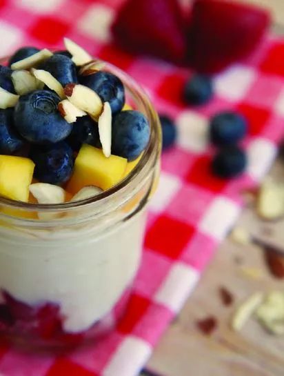 Place strawberries on bottom of small jars or cups. Carefully spoon in vanilla Greek yogurt until 3/4th full. Layer cut mango and top with blueberries. Sprinkle with almond slivers and serve.