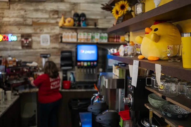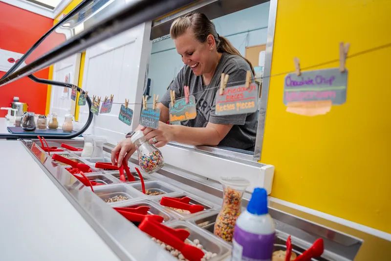 Further down Main Street is the Yogurt Shop, where Jackie Johnson serves up swirly helpings of frozen yogurt with a variety of tasty toppings. The inside of the Yogurt Shop is just as colorful and cheery as the sprinkles customers use to top their yogurt. The walls are covered with colorful circles, and everything from the lime green sofa to the dinette sets is colorful.