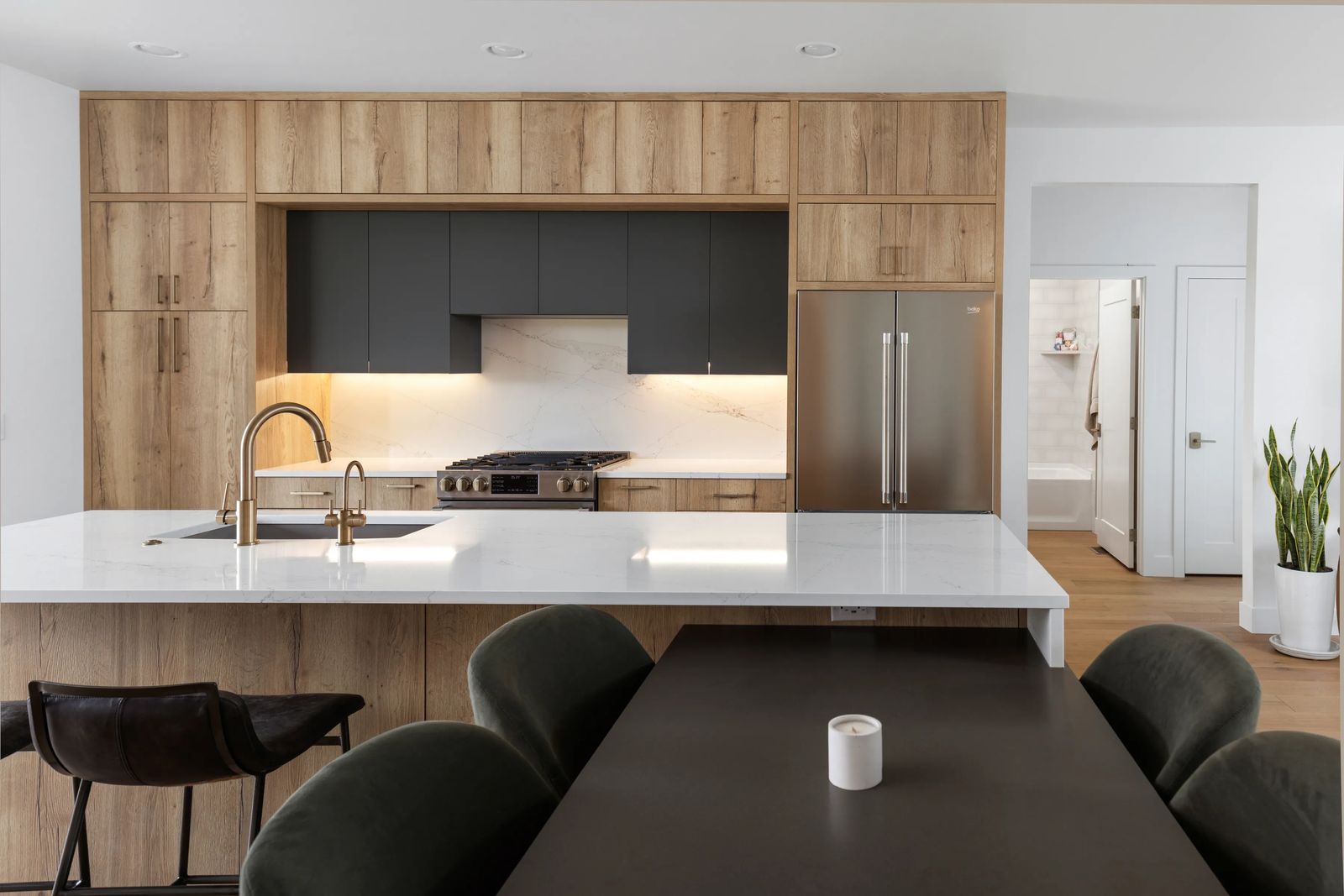 While many materials can achieve this look, Kristy emphasizes the importance of selecting a material that is non-porous and stain resistant. "Beware of marble and limestone, as grease splatters could leave a residue," she warns. The good news is that many of these smooth, non-porous surfaces are also resistant to moisture and bacteria, which is a big plus in high-traffic areas like kitchens and bathrooms.